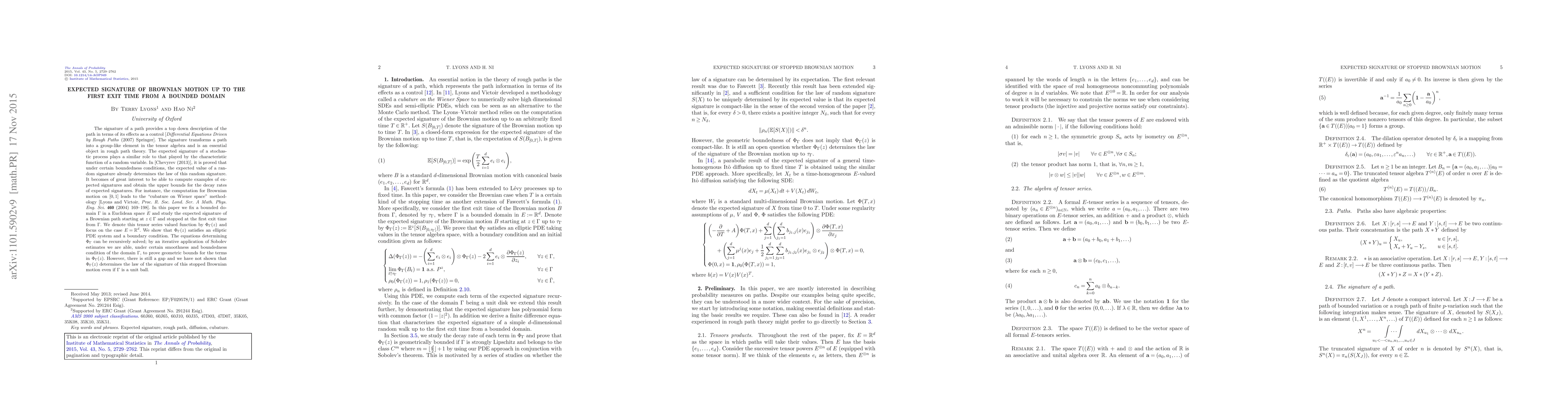 This paper investigates the expected signature of Brownian motion up to the first exit time from a bounded domain $\Gamma$ in $\mathbb{R}^d$. The authors demonstrate that the expected signature $\Phi_{\Gamma}(z)$ satisfies an elliptic PDE system and boundary conditions, and provide geometric bounds for its terms under certain smoothness and boundedness conditions on $\Gamma$.