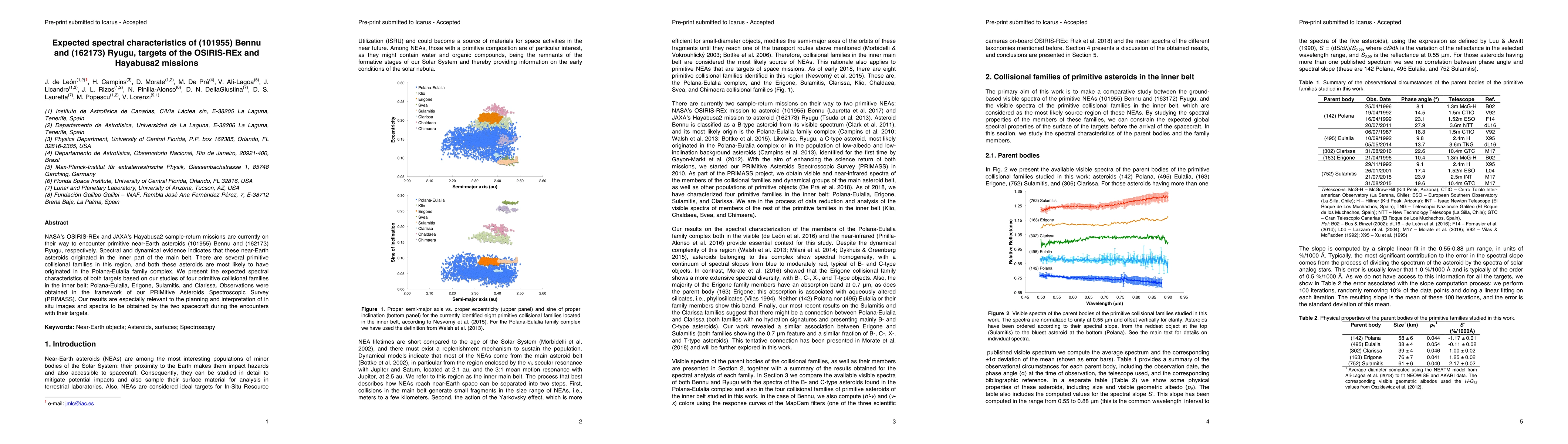 This paper presents expected spectral characteristics of near-Earth asteroids Bennu and Ryugu, based on studies of primitive collisional families in the inner main belt. The findings are crucial for the OSIRIS-REx and Hayabusa2 missions' planning and interpretation of in-situ observations.