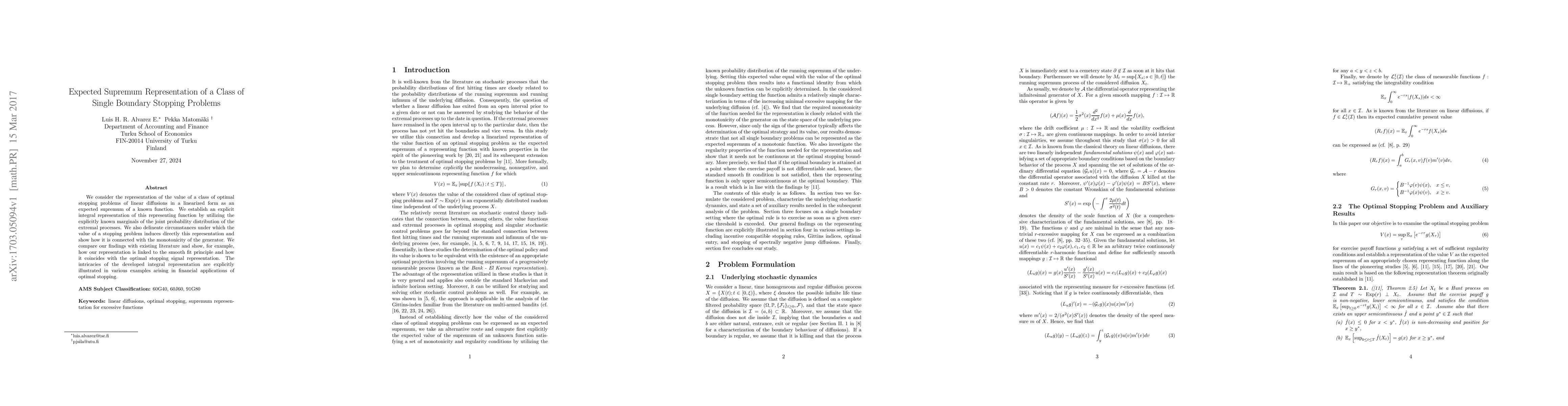 This paper presents an explicit integral representation for the value of optimal stopping problems involving linear diffusions, expressed as an expected supremum of a known function. It connects this representation to the monotonicity of the generator and illustrates its application in financial contexts, linking it to the smooth fit principle and optimal stopping signal representation.