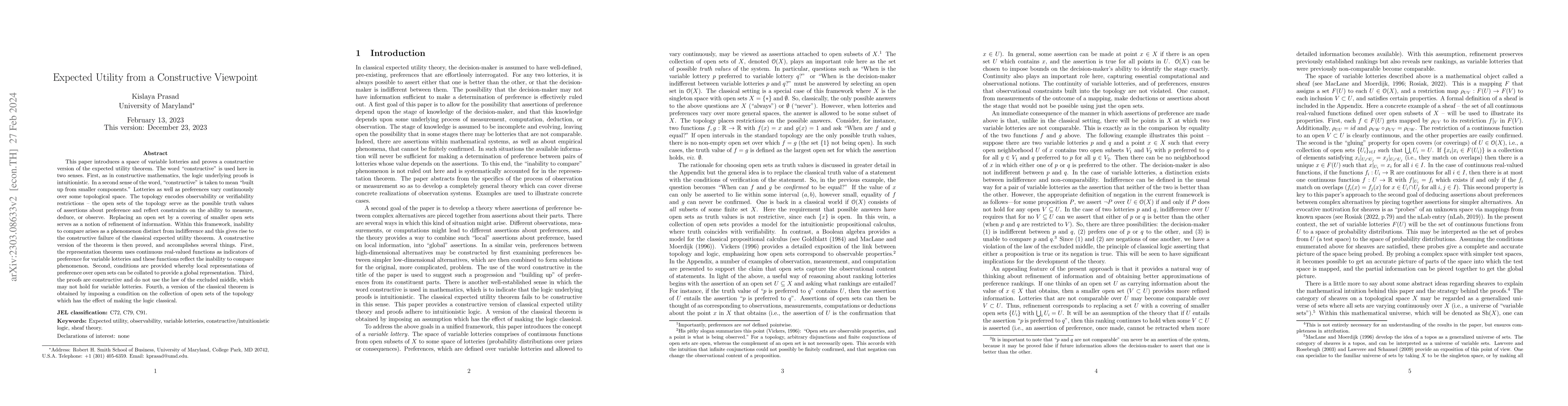 This paper introduces a space of variable lotteries and proves a constructive version of the expected utility theorem. The word ``constructive'' is used here in two senses. First, as in constructive mathematics, the logic underlying proofs is intuitionistic. In a second sense of the word, ``constructive'' is taken to mean ``built up from smaller components.'' Lotteries as well as preferences vary continuously over some topological space. The topology encodes observability or verifiability restrictions -- the open sets of the topology serve as the possible truth values of assertions about preference and reflect constraints on the ability to measure, deduce, or observe. Replacing an open set by a covering of smaller open sets serves as a notion of refinement of information. Within this framework, inability to compare arises as a phenomenon distinct from indifference and this gives rise to the constructive failure of the classical expected utility theorem. A constructive version of the theorem is then proved, and accomplishes several things. First, the representation theorem uses continuous real-valued functions as indicators of preference for variable lotteries and these functions reflect the inability to compare phenomenon. Second, conditions are provided whereby local representations of preference over open sets can be collated to provide a global representation. Third, the proofs are constructive and do not use the law of the excluded middle, which may not hold for variable lotteries. Fourth, a version of the classical theorem is obtained by imposing a condition on the collection of open sets of the topology which has the effect of making the logic classical.