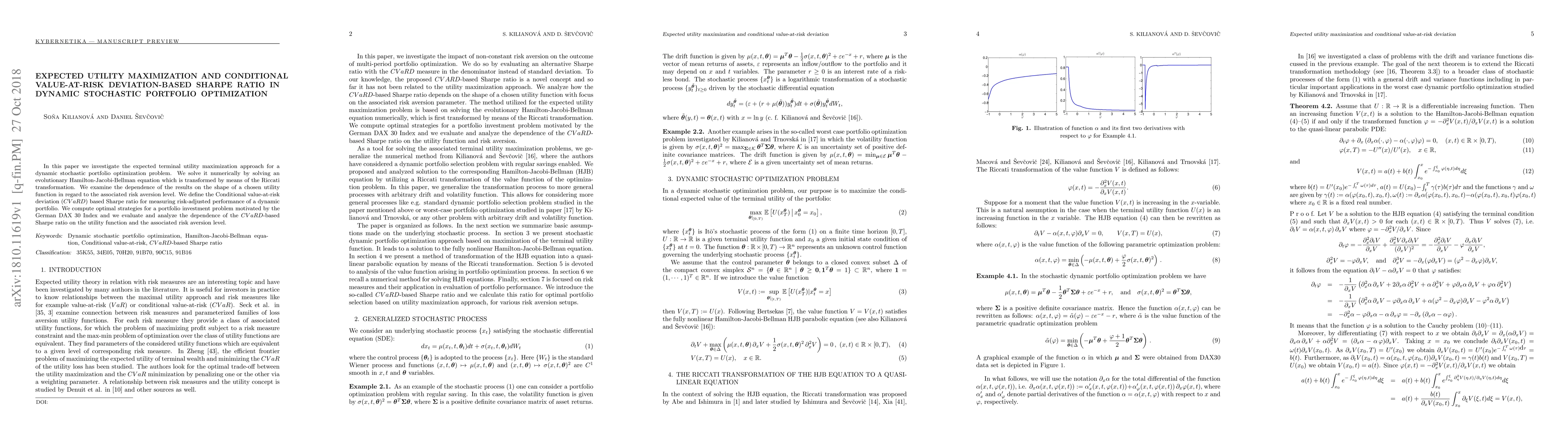This paper explores expected utility maximization in dynamic stochastic portfolio optimization, solving it via an evolutionary Hamilton-Jacobi-Bellman equation. It introduces a $CVaRD$-based Sharpe ratio to measure risk-adjusted performance and analyzes its dependence on the utility function and risk aversion level, using a portfolio investment problem based on the German DAX 30 Index.