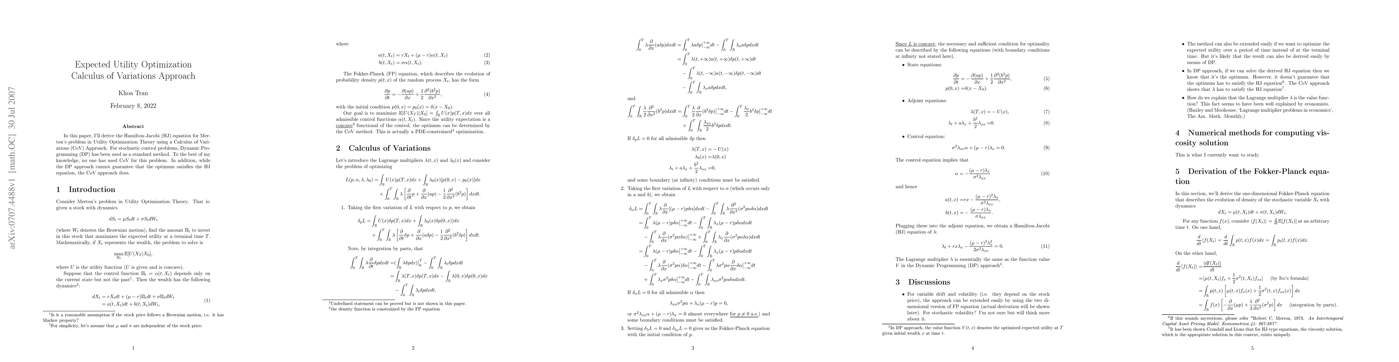 In this paper, I'll derive the Hamilton-Jacobi (HJ) equation for Merton's problem in Utility Optimization Theory using a Calculus of Variations (CoV) Approach. For stochastic control problems, Dynamic Programming (DP) has been used as a standard method. To the best of my knowledge, no one has used CoV for this problem. In addition, while the DP approach cannot guarantee that the optimum satisfies the HJ equation, the CoV approach does. Be aware that this is the first draft of this paper and many flaws might be introduced.