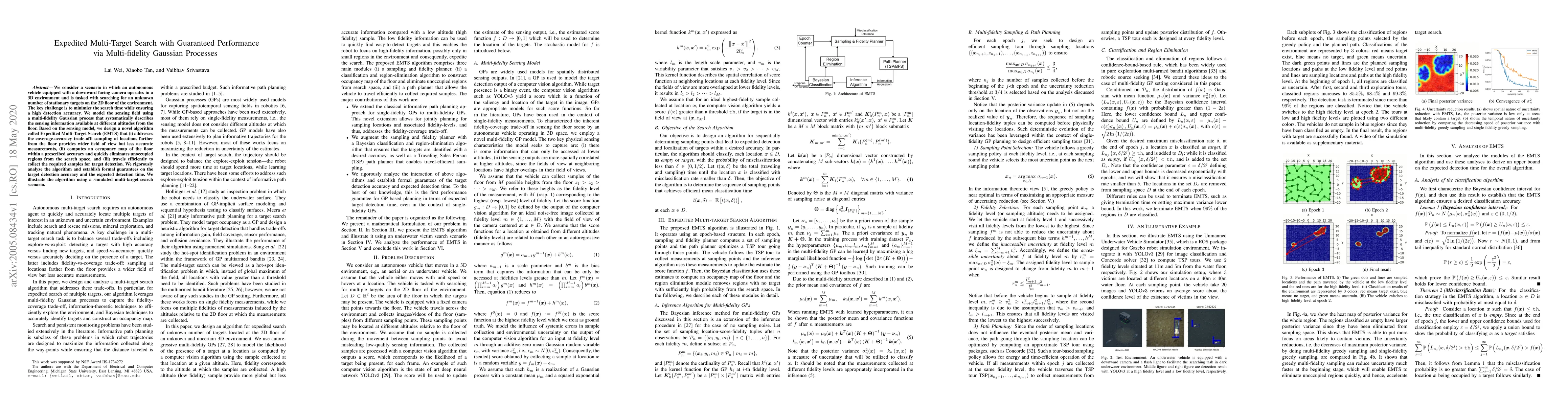 An autonomous vehicle uses a multi-fidelity Gaussian process to efficiently search for stationary targets on a 2D floor while ensuring high detection accuracy, minimizing search time.