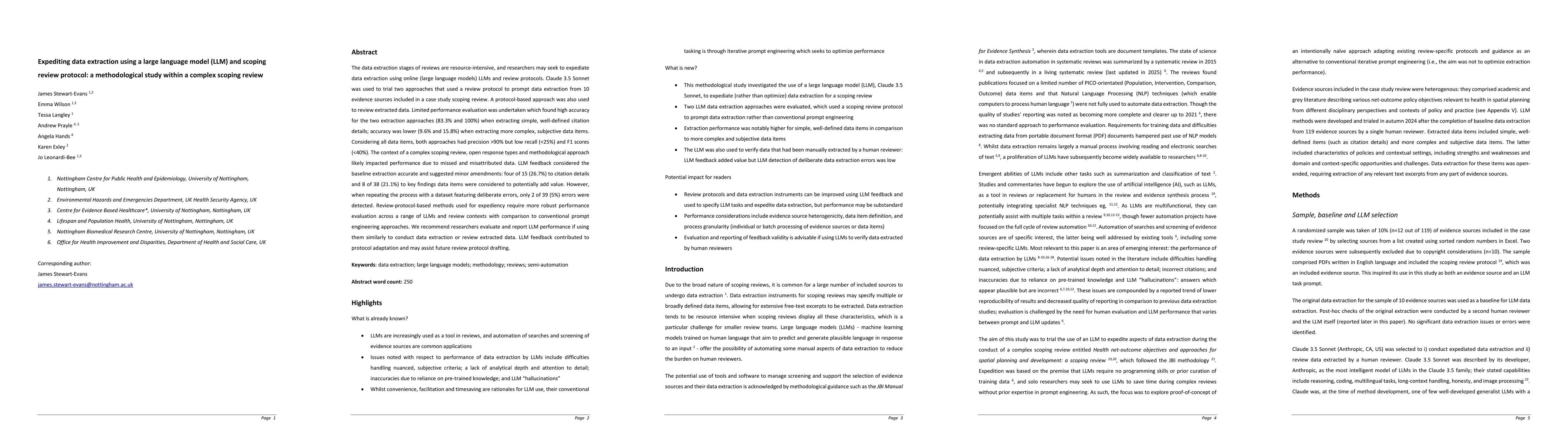 The data extraction stages of reviews are resource-intensive, and researchers may seek to expediate data extraction using online (large language models) LLMs and review protocols. Claude 3.5 Sonnet was used to trial two approaches that used a review protocol to prompt data extraction from 10 evidence sources included in a case study scoping review. A protocol-based approach was also used to review extracted data. Limited performance evaluation was undertaken which found high accuracy for the two extraction approaches (83.3% and 100%) when extracting simple, well-defined citation details; accuracy was lower (9.6% and 15.8%) when extracting more complex, subjective data items. Considering all data items, both approaches had precision >90% but low recall (<25%) and F1 scores (<40%). The context of a complex scoping review, open response types and methodological approach likely impacted performance due to missed and misattributed data. LLM feedback considered the baseline extraction accurate and suggested minor amendments: four of 15 (26.7%) to citation details and 8 of 38 (21.1%) to key findings data items were considered to potentially add value. However, when repeating the process with a dataset featuring deliberate errors, only 2 of 39 (5%) errors were detected. Review-protocol-based methods used for expediency require more robust performance evaluation across a range of LLMs and review contexts with comparison to conventional prompt engineering approaches. We recommend researchers evaluate and report LLM performance if using them similarly to conduct data extraction or review extracted data. LLM feedback contributed to protocol adaptation and may assist future review protocol drafting.