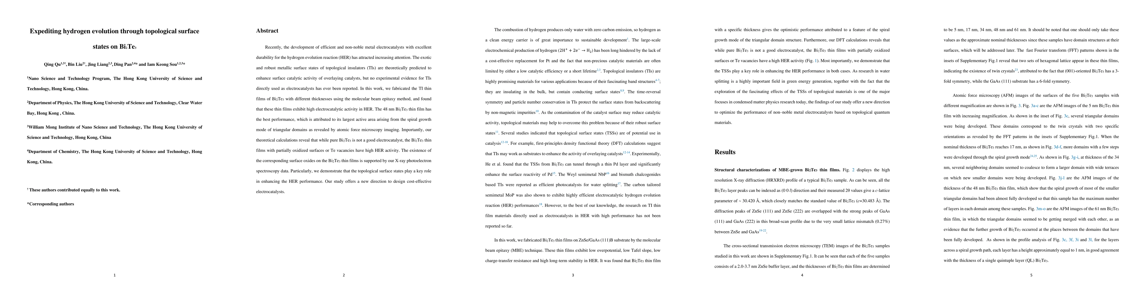 This paper demonstrates that Bi2Te3 thin films, particularly 48 nm thick ones, exhibit high electrocatalytic activity for the hydrogen evolution reaction (HER) due to their spiral growth mode and topological surface states, which enhance HER performance despite pure Bi2Te3 lacking such activity. The study provides a new approach for developing cost-effective HER electrocatalysts.