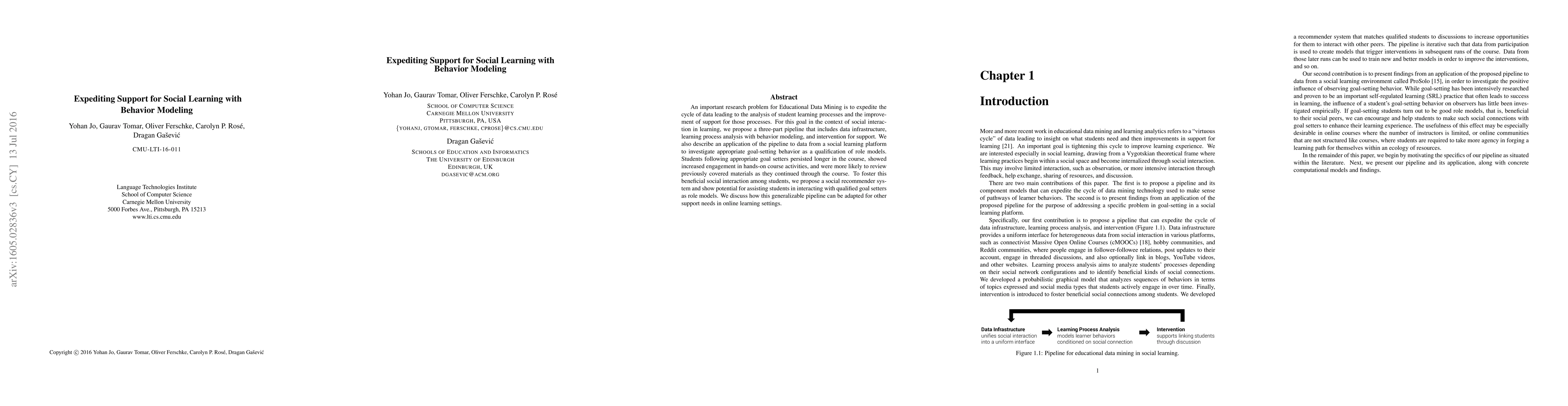 An important research problem for Educational Data Mining is to expedite the cycle of data leading to the analysis of student learning processes and the improvement of support for those processes. For this goal in the context of social interaction in learning, we propose a three-part pipeline that includes data infrastructure, learning process analysis with behavior modeling, and intervention for support. We also describe an application of the pipeline to data from a social learning platform to investigate appropriate goal-setting behavior as a qualification of role models. Students following appropriate goal setters persisted longer in the course, showed increased engagement in hands-on course activities, and were more likely to review previously covered materials as they continued through the course. To foster this beneficial social interaction among students, we propose a social recommender system and show potential for assisting students in interacting with qualified goal setters as role models. We discuss how this generalizable pipeline can be adapted for other support needs in online learning settings.