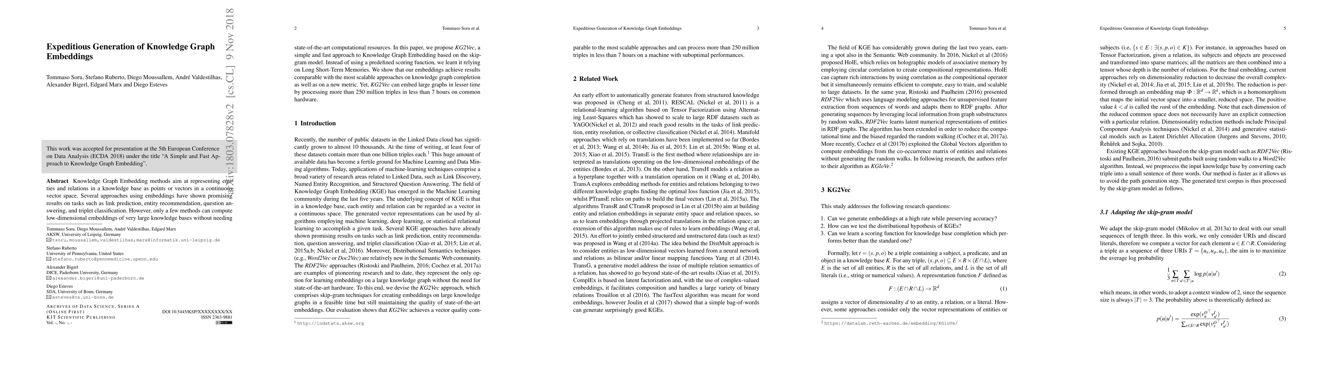 This paper introduces KG2Vec, a fast and scalable Knowledge Graph Embedding method based on the skip-gram model and Long Short-Term Memories, achieving competitive results on knowledge graph completion tasks while embedding large graphs in significantly less time.