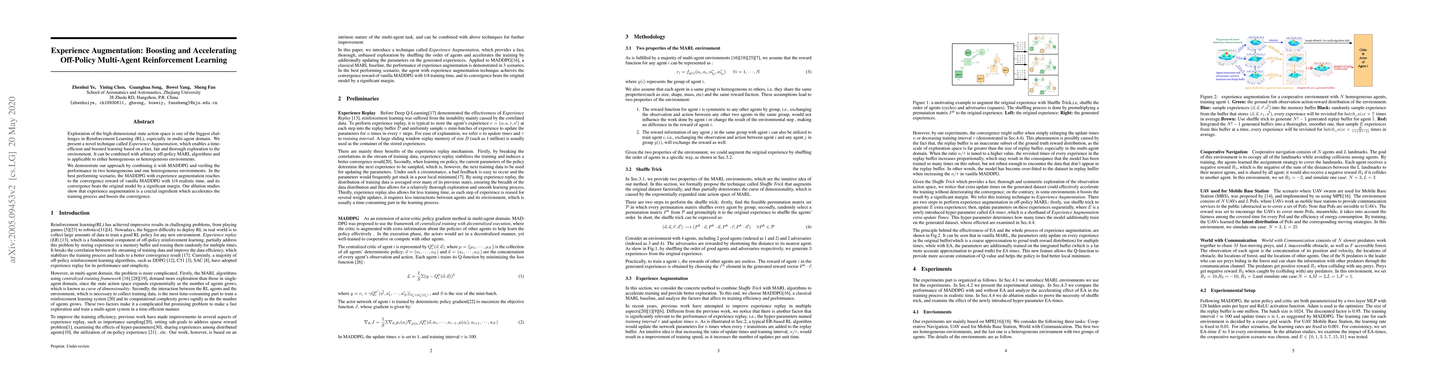 Title: Experience Augmentation: Boosting and Accelerating Off-Policy Multi-Agent Reinforcement Learning Summary: This paper introduces Experience Augmentation, a novel technique that enhances the exploration efficiency in multi-agent reinforcement learning, significantly accelerating training and boosting convergence when combined with off-policy algorithms like MADDPG. The method achieves comparable performance in a fraction of the time compared to traditional methods.