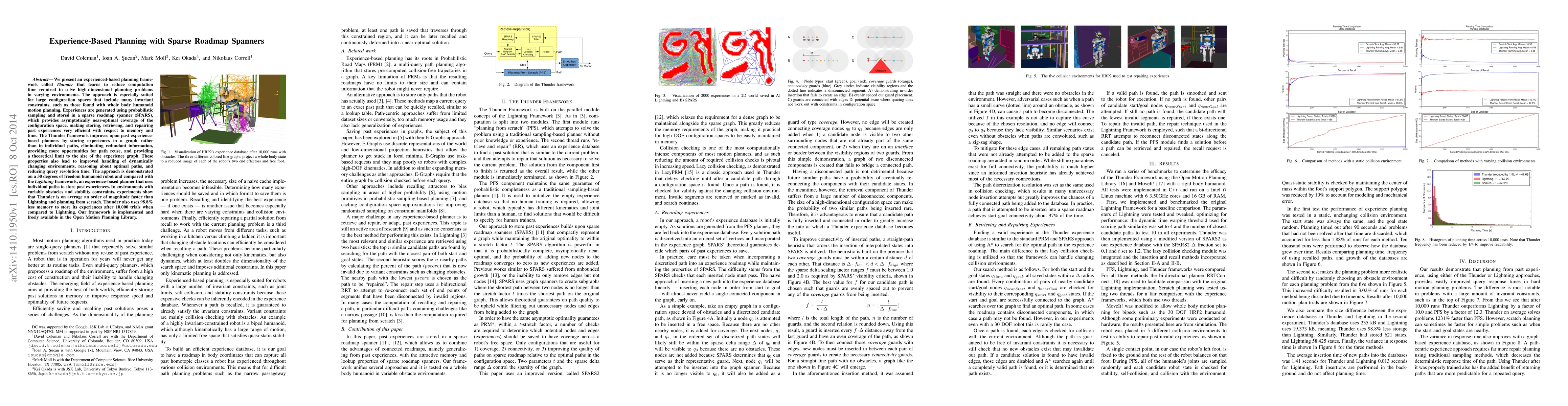 We present an experienced-based planning framework called Thunder that learns to reduce computation time required to solve high-dimensional planning problems in varying environments. The approach is especially suited for large configuration spaces that include many invariant constraints, such as those found with whole body humanoid motion planning. Experiences are generated using probabilistic sampling and stored in a sparse roadmap spanner (SPARS), which provides asymptotically near-optimal coverage of the configuration space, making storing, retrieving, and repairing past experiences very efficient with respect to memory and time. The Thunder framework improves upon past experience-based planners by storing experiences in a graph rather than in individual paths, eliminating redundant information, providing more opportunities for path reuse, and providing a theoretical limit to the size of the experience graph. These properties also lead to improved handling of dynamically changing environments, reasoning about optimal paths, and reducing query resolution time. The approach is demonstrated on a 30 degrees of freedom humanoid robot and compared with the Lightning framework, an experience-based planner that uses individual paths to store past experiences. In environments with variable obstacles and stability constraints, experiments show that Thunder is on average an order of magnitude faster than Lightning and planning from scratch. Thunder also uses 98.8% less memory to store its experiences after 10,000 trials when compared to Lightning. Our framework is implemented and freely available in the Open Motion Planning Library.