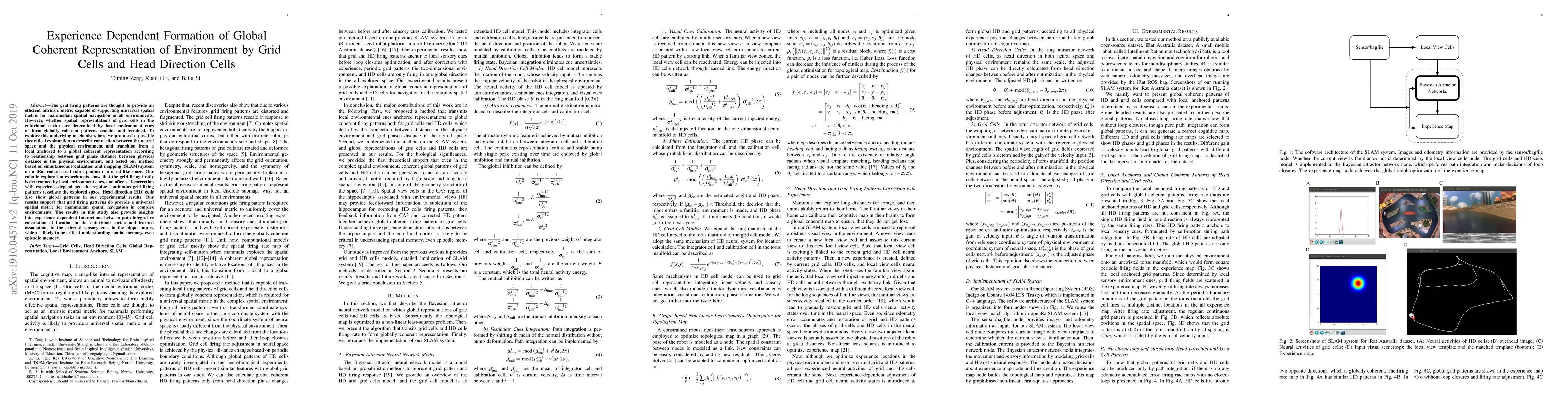 The grid firing patterns are thought to provide an efficient intrinsic metric capable of supporting universal spatial metric for mammalian spatial navigation in all environments. However, whether spatial representations of grid cells in the entorhinal cortex are determined by local environment cues or form globally coherent patterns remains undetermined. To explore this underlying mechanism, here we proposed a possible theoretical explanation to describe connection between the neural space and the physical environment and transition from a local anchored to a global coherent representation according to relationship between grid phase distance between physical distance in the physical environment, and tested our method based on simultaneous localization and mapping (SLAM) system on a iRat rodent-sized robot platform in a rat-like maze. Our robotic exploration experiments show that the grid firing firstly is determined by local environment cues, and after self-correction with experience-dependence, the regular, continuous grid firing patterns tessellate the explored space. Head direction (HD) cells also show global patterns in our experimental results. Our results support that grid firing patterns do provide a universal spatial metric for mammalian spatial navigation in complex environments. The results in this study also provide insights into experience-dependent interactions between path integrative calculation of location in the entorhinal cortex and learned associations to the external sensory cues in the hippocampus, which is likely to be critical understanding spatial memory, even episodic memory.