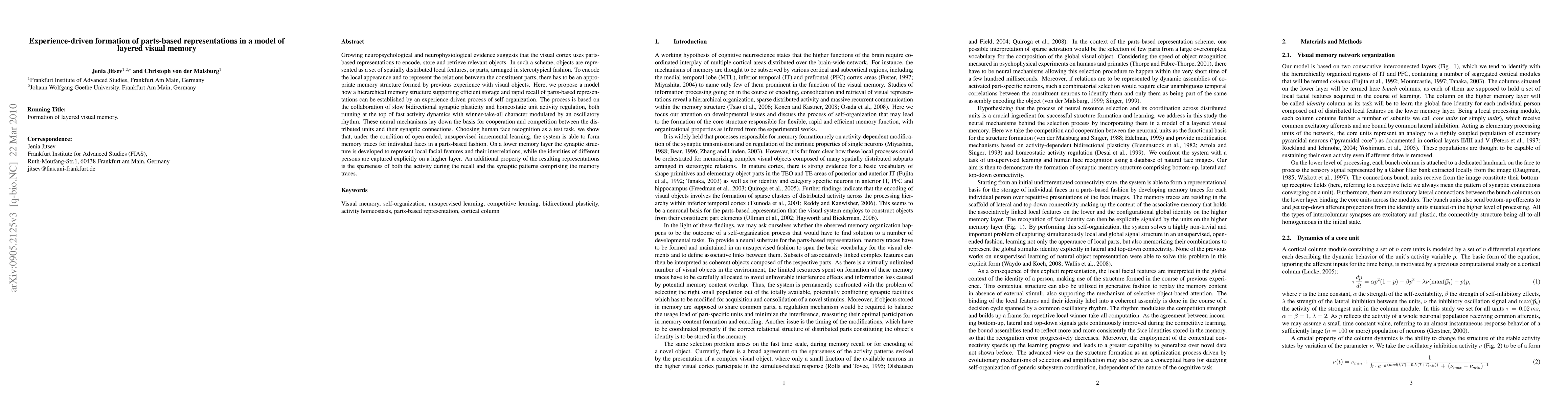 Growing neuropsychological and neurophysiological evidence suggests that the visual cortex uses parts-based representations to encode, store and retrieve relevant objects. In such a scheme, objects are represented as a set of spatially distributed local features, or parts, arranged in stereotypical fashion. To encode the local appearance and to represent the relations between the constituent parts, there has to be an appropriate memory structure formed by previous experience with visual objects. Here, we propose a model how a hierarchical memory structure supporting efficient storage and rapid recall of parts-based representations can be established by an experience-driven process of self-organization. The process is based on the collaboration of slow bidirectional synaptic plasticity and homeostatic unit activity regulation, both running at the top of fast activity dynamics with winner-take-all character modulated by an oscillatory rhythm. These neural mechanisms lay down the basis for cooperation and competition between the distributed units and their synaptic connections. Choosing human face recognition as a test task, we show that, under the condition of open-ended, unsupervised incremental learning, the system is able to form memory traces for individual faces in a parts-based fashion. On a lower memory layer the synaptic structure is developed to represent local facial features and their interrelations, while the identities of different persons are captured explicitly on a higher layer. An additional property of the resulting representations is the sparseness of both the activity during the recall and the synaptic patterns comprising the memory traces.