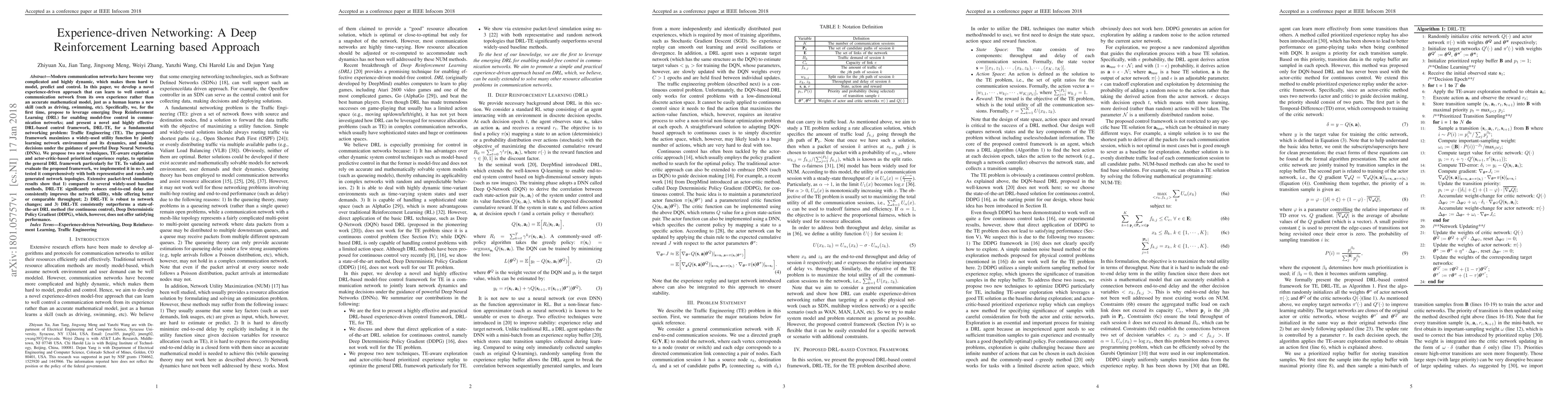 Modern communication networks have become very complicated and highly dynamic, which makes them hard to model, predict and control. In this paper, we develop a novel experience-driven approach that can learn to well control a communication network from its own experience rather than an accurate mathematical model, just as a human learns a new skill (such as driving, swimming, etc). Specifically, we, for the first time, propose to leverage emerging Deep Reinforcement Learning (DRL) for enabling model-free control in communication networks; and present a novel and highly effective DRL-based control framework, DRL-TE, for a fundamental networking problem: Traffic Engineering (TE). The proposed framework maximizes a widely-used utility function by jointly learning network environment and its dynamics, and making decisions under the guidance of powerful Deep Neural Networks (DNNs). We propose two new techniques, TE-aware exploration and actor-critic-based prioritized experience replay, to optimize the general DRL framework particularly for TE. To validate and evaluate the proposed framework, we implemented it in ns-3, and tested it comprehensively with both representative and randomly generated network topologies. Extensive packet-level simulation results show that 1) compared to several widely-used baseline methods, DRL-TE significantly reduces end-to-end delay and consistently improves the network utility, while offering better or comparable throughput; 2) DRL-TE is robust to network changes; and 3) DRL-TE consistently outperforms a state-ofthe-art DRL method (for continuous control), Deep Deterministic Policy Gradient (DDPG), which, however, does not offer satisfying performance.