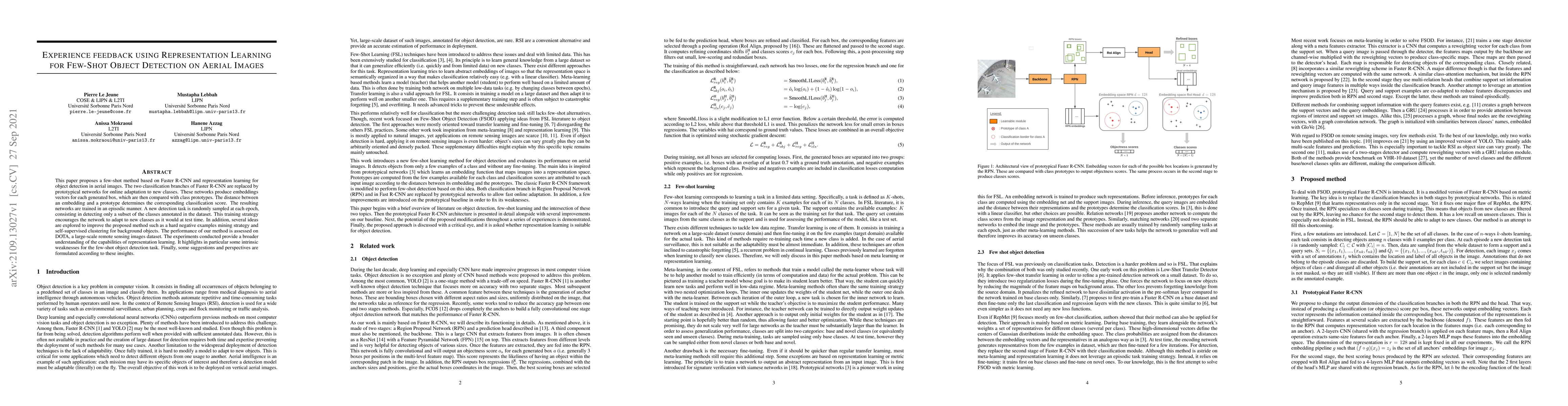 This paper proposes a few-shot method based on Faster R-CNN and representation learning for object detection in aerial images. The two classification branches of Faster R-CNN are replaced by prototypical networks for online adaptation to new classes. These networks produce embeddings vectors for each generated box, which are then compared with class prototypes. The distance between an embedding and a prototype determines the corresponding classification score. The resulting networks are trained in an episodic manner. A new detection task is randomly sampled at each epoch, consisting in detecting only a subset of the classes annotated in the dataset. This training strategy encourages the network to adapt to new classes as it would at test time. In addition, several ideas are explored to improve the proposed method such as a hard negative examples mining strategy and self-supervised clustering for background objects. The performance of our method is assessed on DOTA, a large-scale remote sensing images dataset. The experiments conducted provide a broader understanding of the capabilities of representation learning. It highlights in particular some intrinsic weaknesses for the few-shot object detection task. Finally, some suggestions and perspectives are formulated according to these insights.