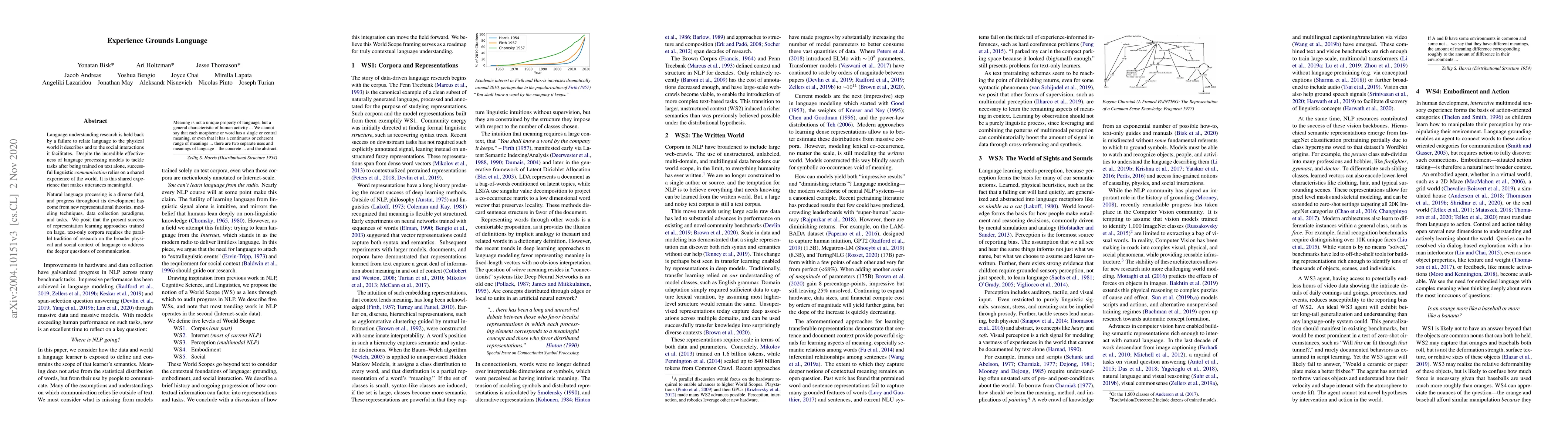 Language understanding research is held back by a failure to relate language to the physical world it describes and to the social interactions it facilitates. Despite the incredible effectiveness of language processing models to tackle tasks after being trained on text alone, successful linguistic communication relies on a shared experience of the world. It is this shared experience that makes utterances meaningful. Natural language processing is a diverse field, and progress throughout its development has come from new representational theories, modeling techniques, data collection paradigms, and tasks. We posit that the present success of representation learning approaches trained on large, text-only corpora requires the parallel tradition of research on the broader physical and social context of language to address the deeper questions of communication.