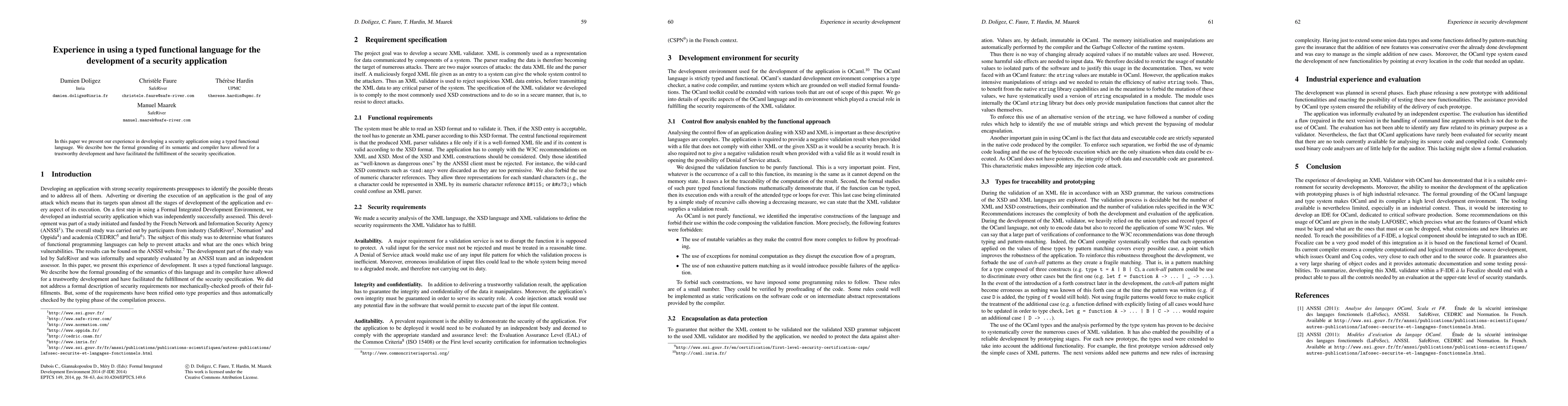In this paper we present our experience in developing a security application using a typed functional language. We describe how the formal grounding of its semantic and compiler have allowed for a trustworthy development and have facilitated the fulfillment of the security specification.