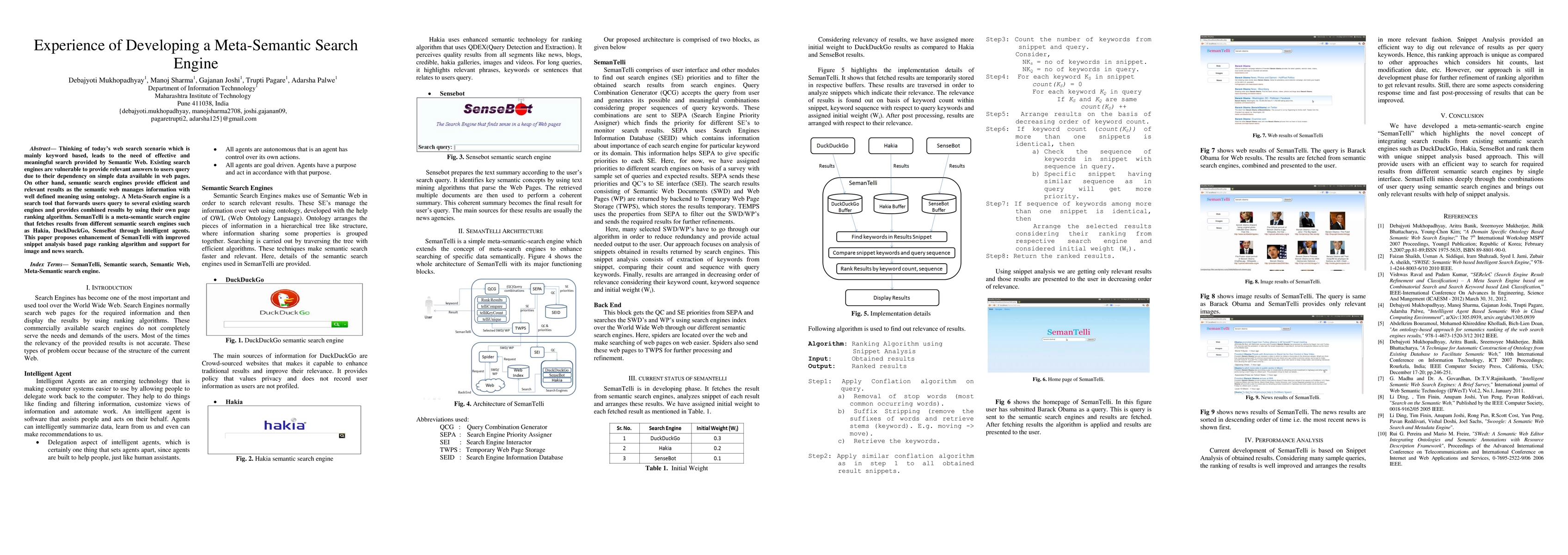 The paper describes the development of SemanTelli, a meta-semantic search engine that combines results from various semantic search engines like DuckDuckGo, Hakia, and SenseBot using intelligent agents.