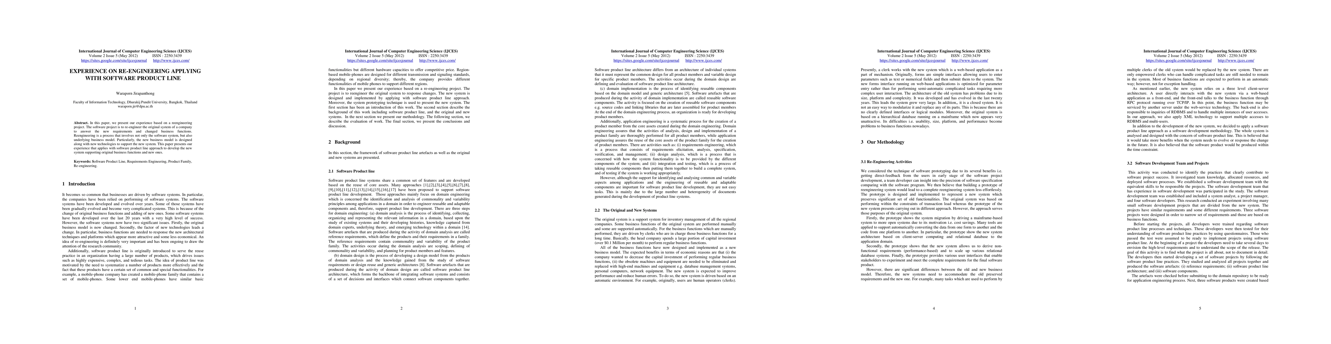 In this paper, we present our experience based on a reengineering project. The software project is to re-engineer the original system of a company to answer the new requirements and changed business functions. Reengineering is a process that involves not only the software system, but also underlying business model. Particularly, the new business model is designed along with new technologies to support the new system. This paper presents our experience that applies with software product line approach to develop the new system supporting original business functions and new ones.