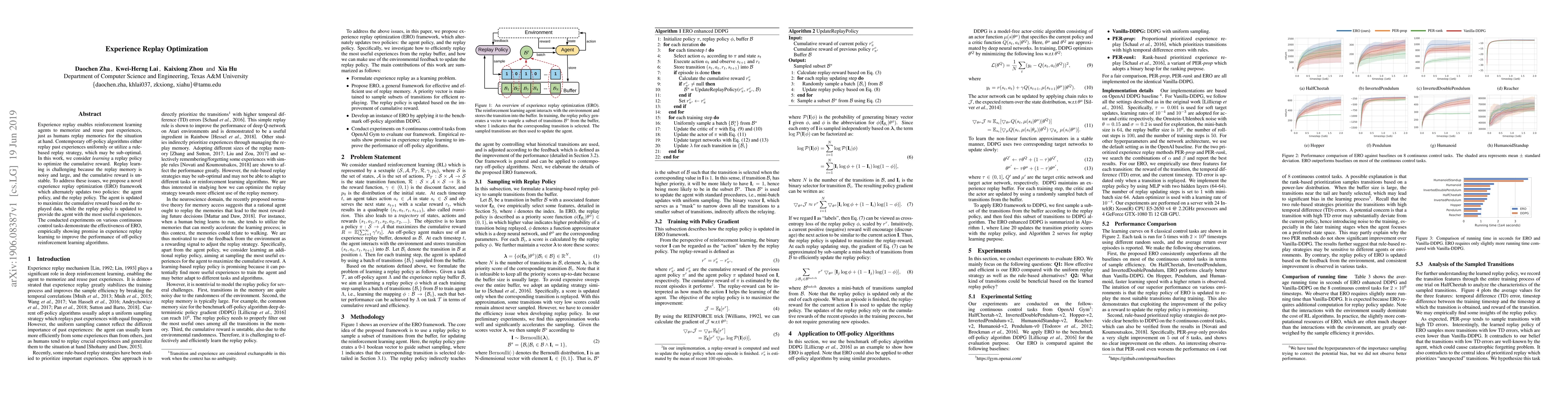 Experience replay enables reinforcement learning agents to memorize and reuse past experiences, just as humans replay memories for the situation at hand. Contemporary off-policy algorithms either replay past experiences uniformly or utilize a rule-based replay strategy, which may be sub-optimal. In this work, we consider learning a replay policy to optimize the cumulative reward. Replay learning is challenging because the replay memory is noisy and large, and the cumulative reward is unstable. To address these issues, we propose a novel experience replay optimization (ERO) framework which alternately updates two policies: the agent policy, and the replay policy. The agent is updated to maximize the cumulative reward based on the replayed data, while the replay policy is updated to provide the agent with the most useful experiences. The conducted experiments on various continuous control tasks demonstrate the effectiveness of ERO, empirically showing promise in experience replay learning to improve the performance of off-policy reinforcement learning algorithms.