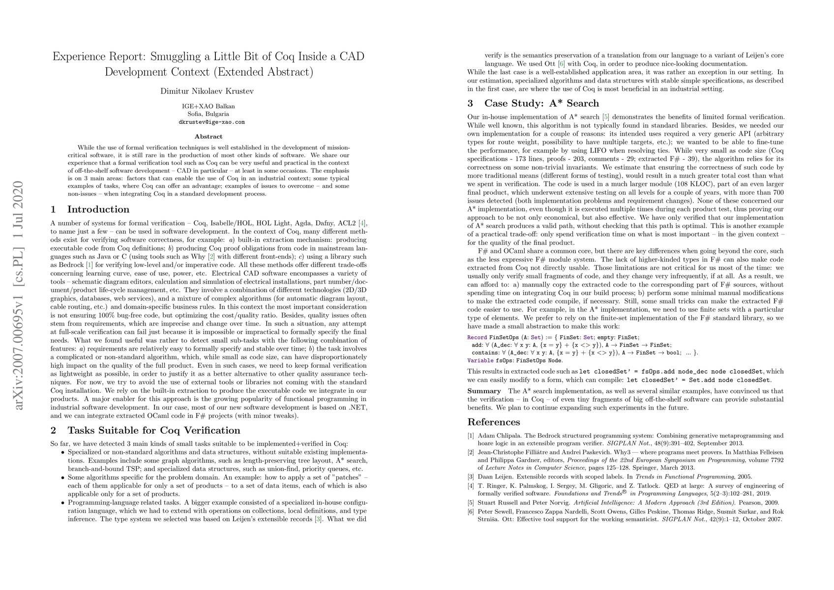 While the use of formal verification techniques is well established in the development of mission-critical software, it is still rare in the production of most other kinds of software. We share our experience that a formal verification tool such as Coq can be very useful and practical in the context of off-the-shelf software development -- CAD in particular -- at least in some occasions. The emphasis is on 3 main areas: factors that can enable the use of Coq in an industrial context; some typical examples of tasks, where Coq can offer an advantage; examples of issues to overcome - and some non-issues - when integrating Coq in a standard development process.