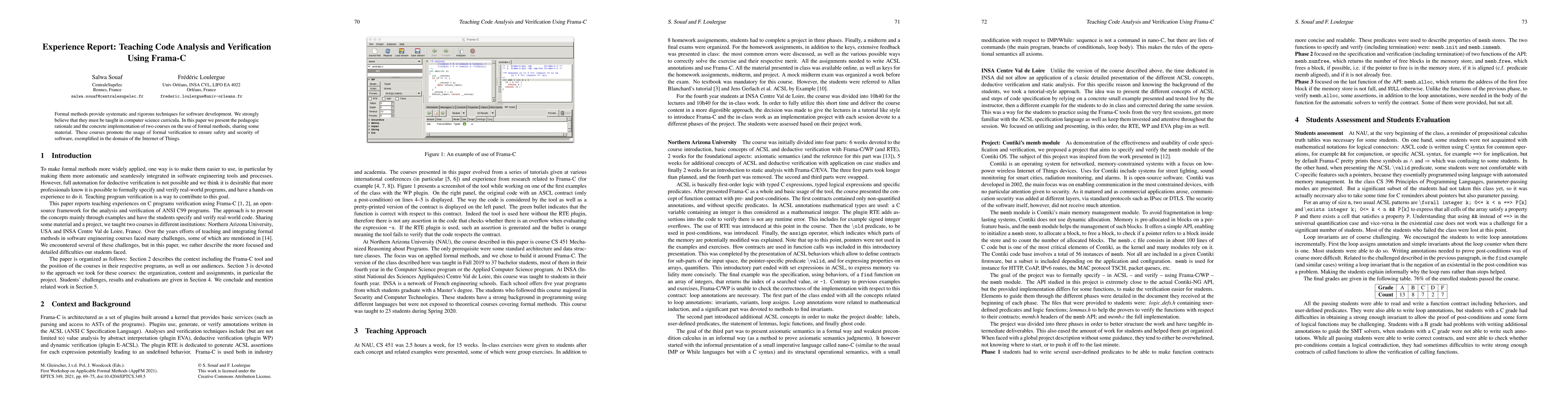 This paper presents a pedagogic approach to teaching formal methods in computer science courses, focusing on code analysis and verification for software safety and security. It shares a course implementation experience report with the goal of promoting the use of formal verification in the Internet of Things domain.
