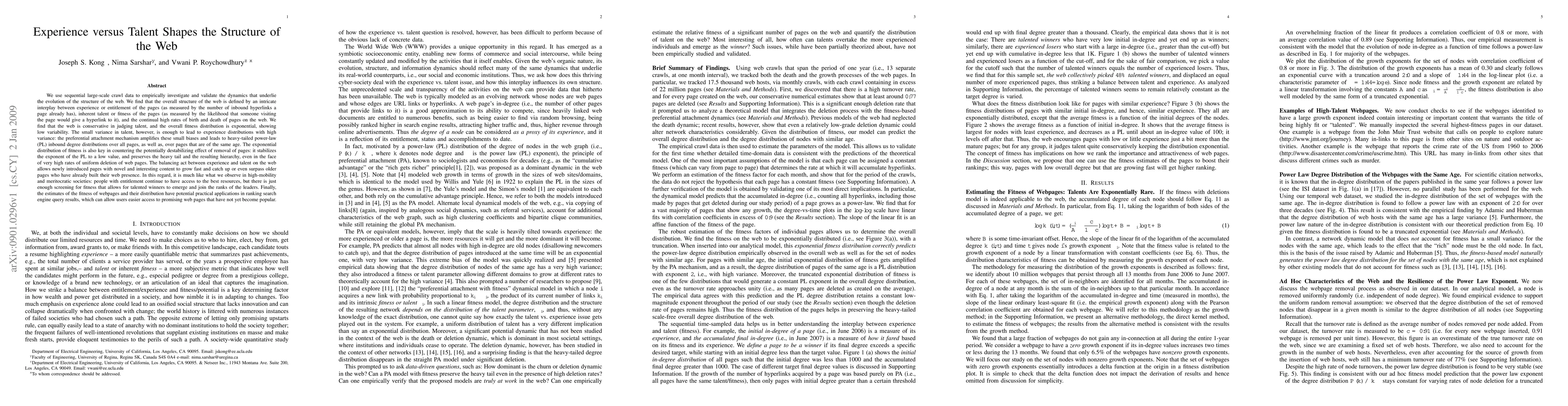 The web's structure is shaped by a balance between experience and talent, leading to power-law distributions of hyperlinks and the emergence of new leaders with novel content. The findings have practical applications in ranking query results.