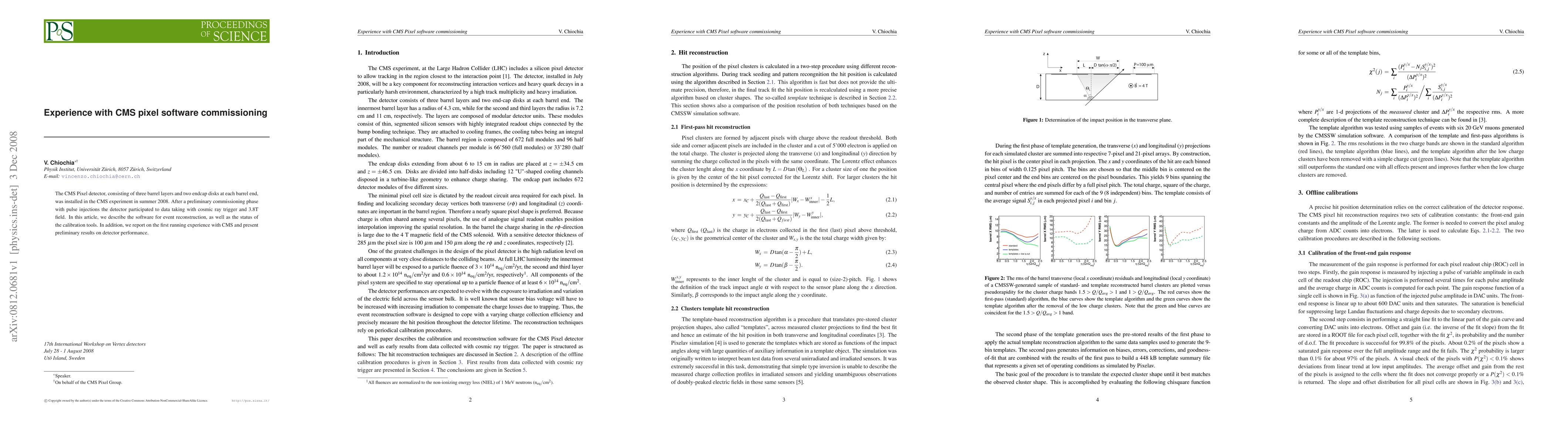 The CMS Pixel detector, consisting of three barrel layers and two endcap disks at each barrel end, was installed in the CMS experiment in summer 2008. After a preliminary commissioning phase with pulse injections the detector participated to data taking with cosmic ray trigger and 3.8T field. In this article, we describe the software for event reconstruction, as well as the status of the calibration tools. In addition, we report on the first running experience with CMS and present preliminary results on detector performance.