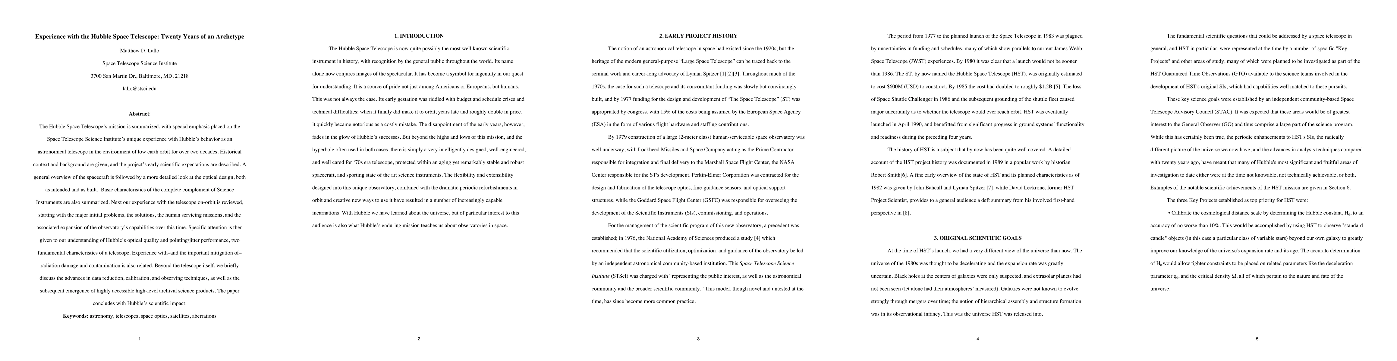 The Hubble Space Telescope's mission is summarized, with special emphasis placed on the Space Telescope Science Institute's unique experience with Hubble's behavior as an astronomical telescope in the environment of low earth orbit for over two decades. Historical context and background are given, and the project's early scientific expectations are described. A general overview of the spacecraft is followed by a more detailed look at the optical design, both as intended and as built. Basic characteristics of the complete complement of science instruments are also summarized. Experience with the telescope on-orbit is reviewed, starting with the major initial problems, solutions, human servicing missions, and the associated expansion of the observatory's capabilities over this time. Specific attention is then given to understanding Hubble's optical quality and pointing/jitter performance, two fundamental characteristics of a telescope. Experience with-and the important mitigation of-radiation damage and contamination is also related. Beyond the telescope itself, the advances in data reduction, calibration, and observing techniques are briefly discussed, as well as the subsequent emergence of highly accessible high-level archival science products. Hubble's scientific impact concludes the discussion.