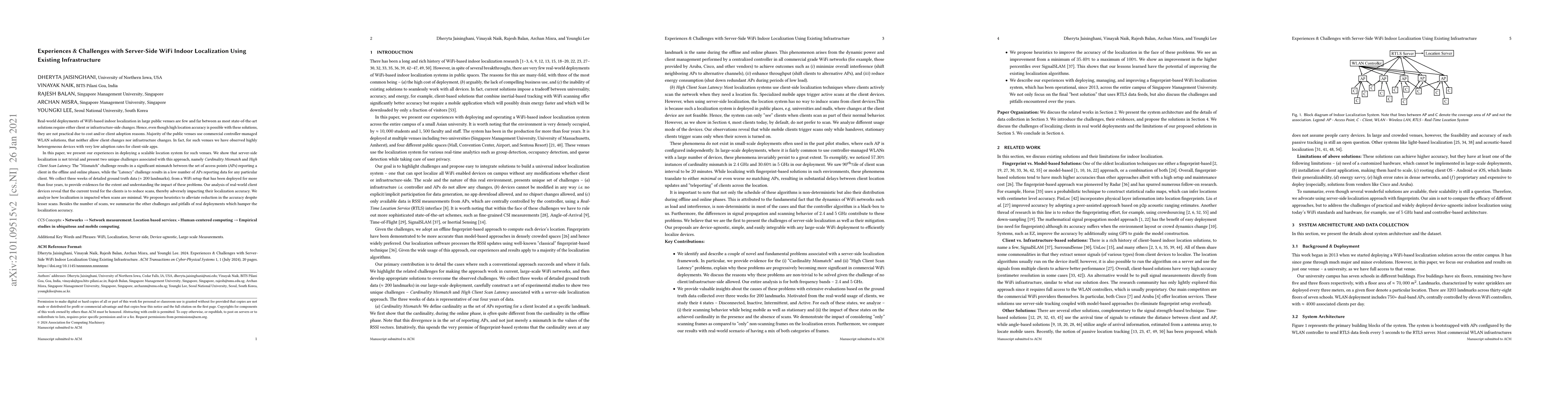 This paper explores deploying server-side WiFi indoor localization using existing commercial infrastructure, highlighting two main challenges: Cardinality Mismatch and High Client Scan Latency. The authors propose heuristics to mitigate accuracy loss due to minimal client scans and discuss other deployment pitfalls affecting localization accuracy.