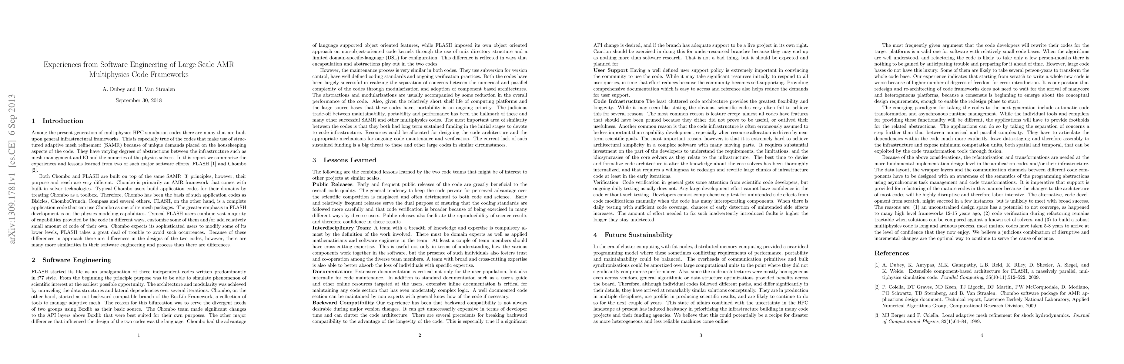 This paper summarizes experiences from the software engineering of large-scale AMR multiphysics codes, focusing on the FLASH and Chombo frameworks. It highlights the unique challenges and lessons learned in managing infrastructure and abstraction layers between mesh management and physics solvers.