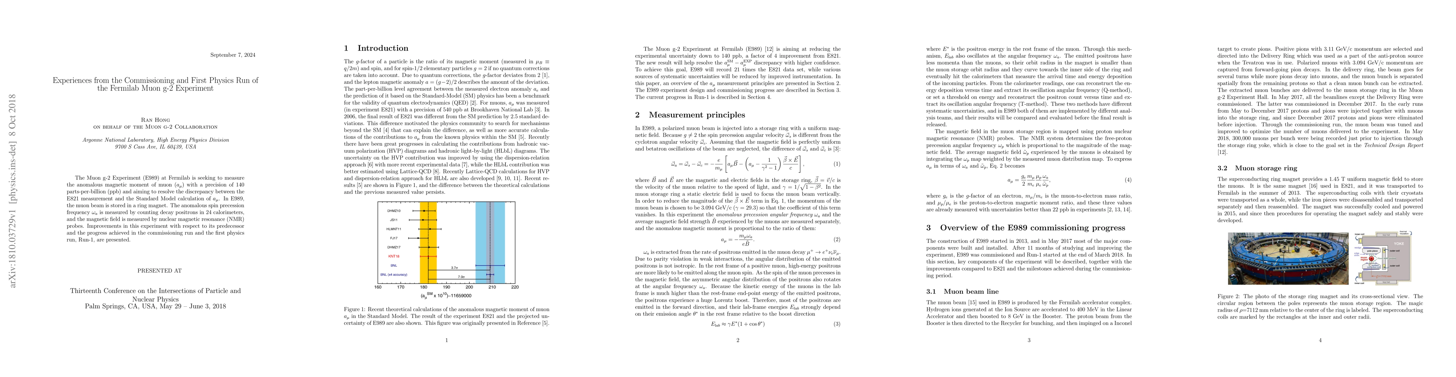 The Fermilab Muon g-2 Experiment (E989) aims to measure the muon's anomalous magnetic moment with unprecedented precision, addressing discrepancies between experimental and theoretical values. The experiment successfully completed commissioning and its first physics run, demonstrating significant improvements over its predecessor.
