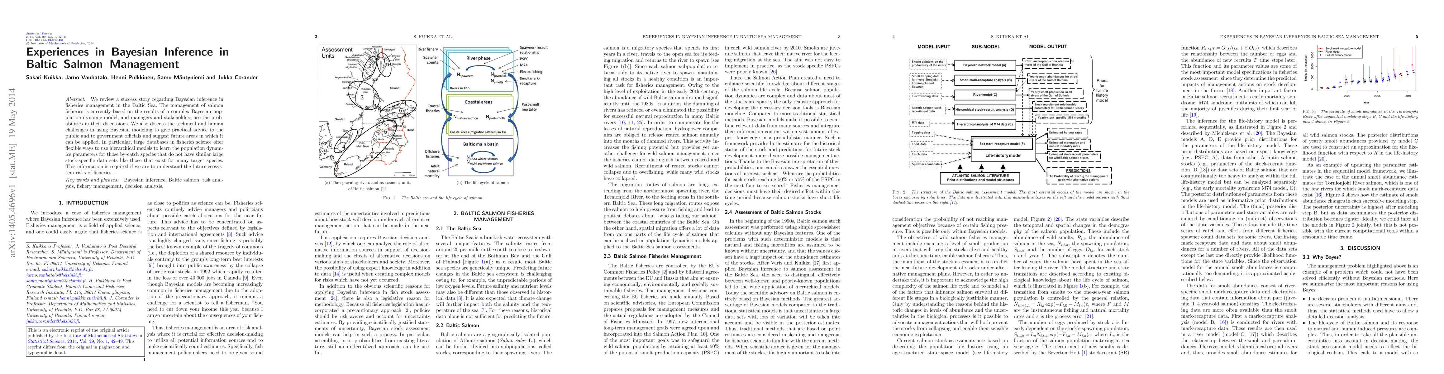 This paper reviews the successful implementation of Bayesian inference in managing Baltic salmon fisheries, highlighting the use of complex Bayesian models for population dynamics. It discusses the challenges and future applications of Bayesian modeling in fisheries management, emphasizing the potential for hierarchical models to address data gaps for by-catch species.