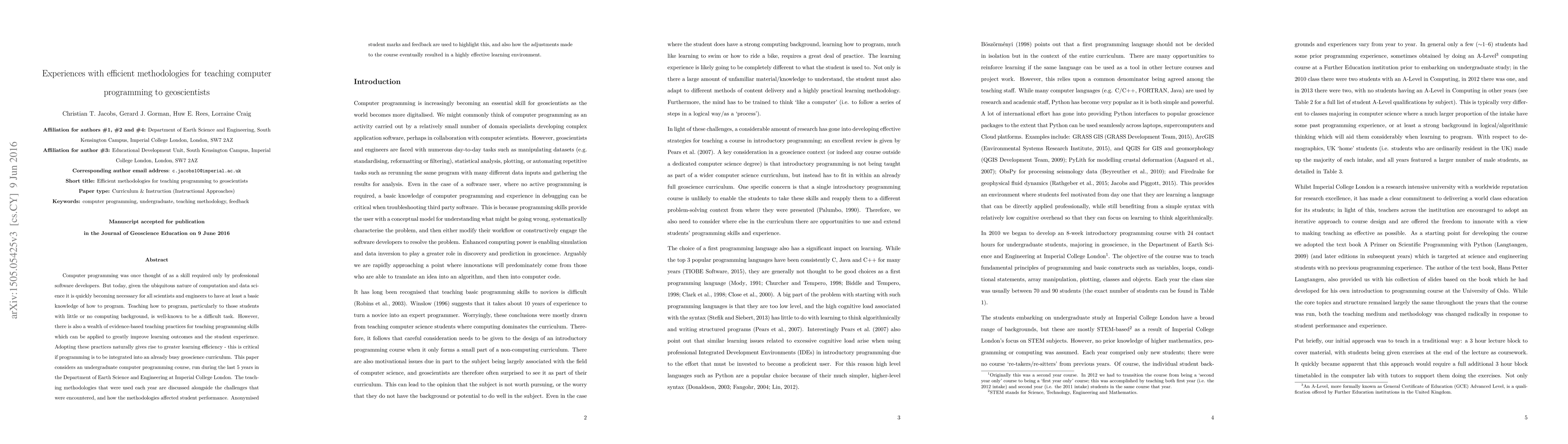 This paper examines the teaching methodologies used over five years to teach computer programming to geoscience undergraduates, highlighting the challenges faced and the impact on student performance. Adjustments based on anonymised student feedback and marks have led to a highly effective learning environment.