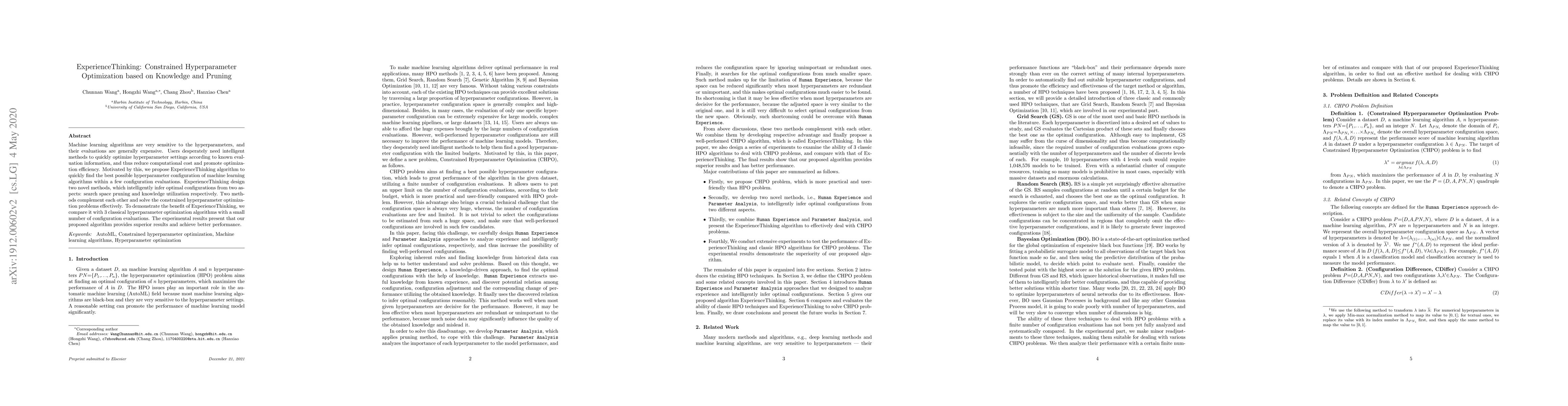 Machine learning algorithms are very sensitive to the hyperparameters, and their evaluations are generally expensive. Users desperately need intelligent methods to quickly optimize hyperparameter settings according to known evaluation information, and thus reduce computational cost and promote optimization efficiency. Motivated by this, we propose ExperienceThinking algorithm to quickly find the best possible hyperparameter configuration of machine learning algorithms within a few configuration evaluations. ExperienceThinking design two novel methods, which intelligently infer optimal configurations from two aspects: search space pruning and knowledge utilization respectively. Two methods complement each other and solve the constrained hyperparameter optimization problems effectively. To demonstrate the benefit of ExperienceThinking, we compare it with 3 classical hyperparameter optimization algorithms with a small number of configuration evaluations. The experimental results present that our proposed algorithm provides superior results and achieve better performance.
