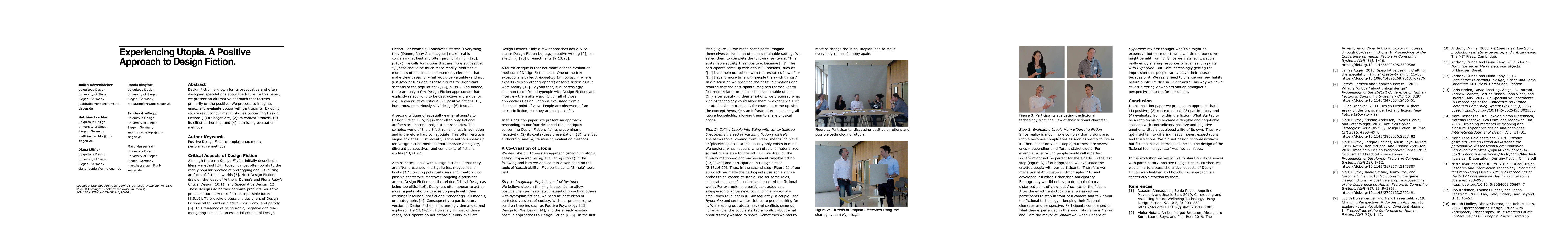 This paper proposes a positive approach to Design Fiction by imagining and evaluating utopia with participants, addressing critiques of negativity, contextlessness, elitism, and evaluation methods. It presents an alternative methodology for creating more optimistic and inclusive futures.