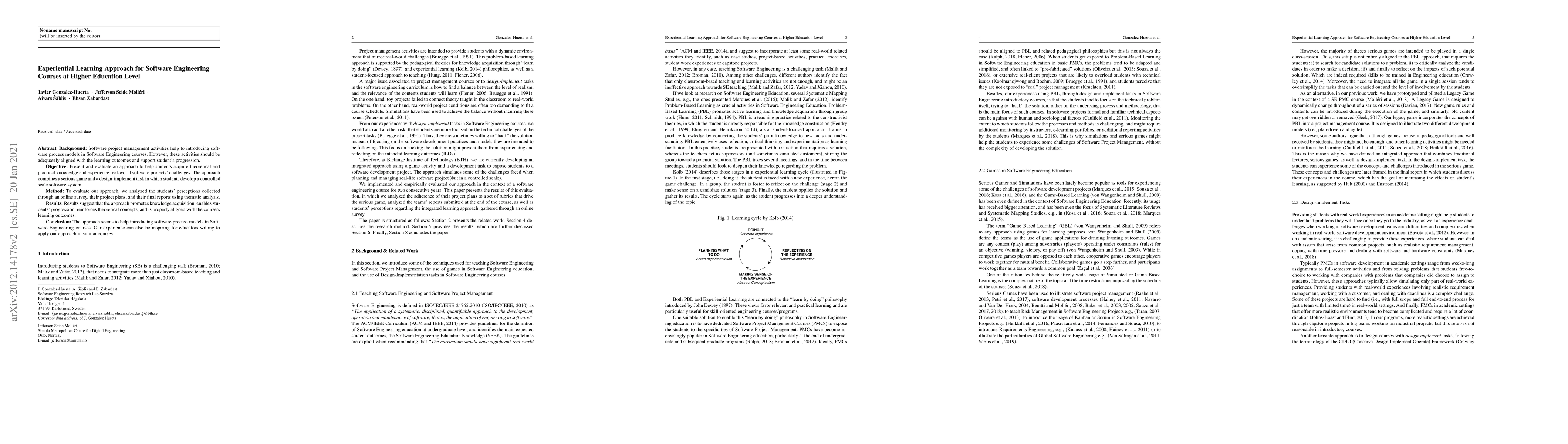 This research presents an experiential learning approach combining a serious game and a design-implement task to help students gain theoretical and practical knowledge in software engineering. The evaluation through surveys and thematic analysis indicates that the approach effectively promotes knowledge acquisition and aligns well with course learning outcomes.