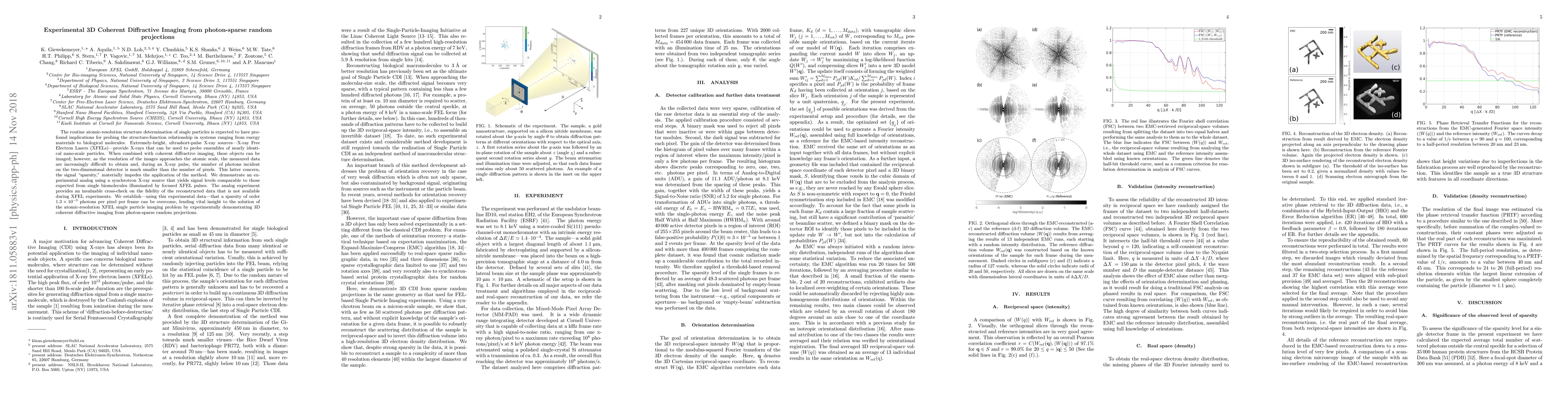 This paper demonstrates experimental 3D coherent diffractive imaging using photon-sparse random projections from a synchrotron X-ray source, providing a valuable analog for XFEL imaging. It shows that a sparsity of $1.3\times10^{-3}$ photons per pixel can be overcome, offering crucial insights for atomic-resolution single particle imaging with XFELs.