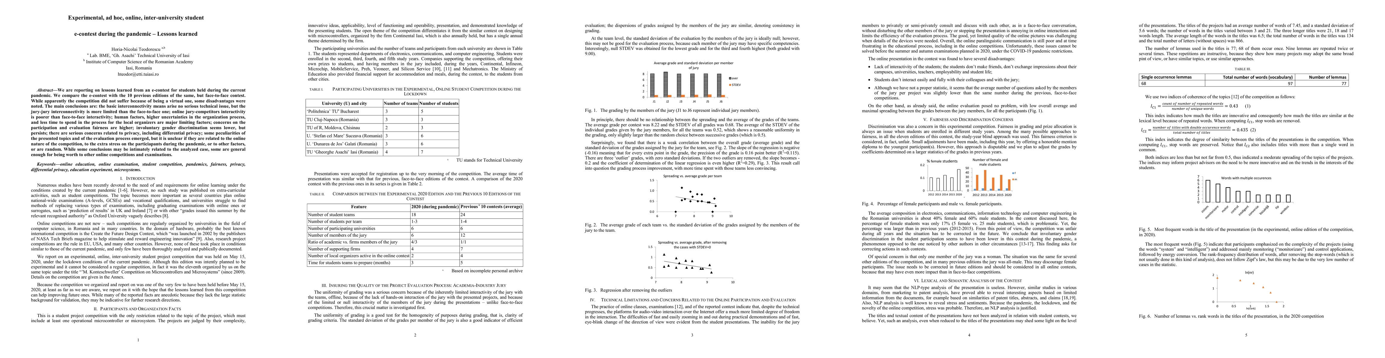 We are reporting on lessons learned from an e-contest for students held during the current pandemic. We compare the e-contest with the 10 previous editions of the same but face-to-face contest. While apparently the competition did not suffer because of being a virtual one, some disadvantages were noted. The main conclusions are: the basic interconnectivity means arise no serious technical issue, but the interconnectivity is more limited than the face-to-face one; online jury-competitors interactivity is poorer than face-to-face interactivity; human factors, higher uncertainties in the organization process, and less time to spend in the process for the local organizers are major limiting factors; concerns on the participation and evaluation fairness are higher; involuntary gender discrimination seems lower, but persists; there are serious concerns related to privacy, including differential privacy; some peculiarities of the presented topics and of the evaluation process emerged, but it is unclear if they are related to the online nature of the competition, to the extra stress on the participants during the pandemic, to other factors, or are random. While some conclusions may be intimately related to the analyzed case, some are general enough for being worth to other online competitions.