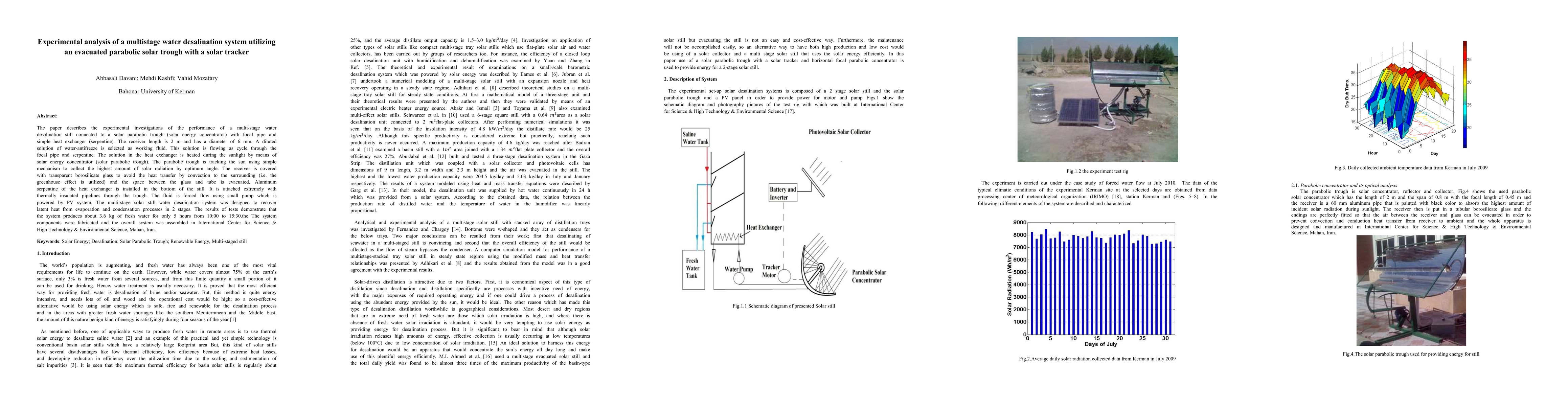 This paper investigates a multi-stage water desalination system powered by a solar parabolic trough with a solar tracker, producing approximately 3.6 kg of fresh water in 5 hours. The system utilizes an evacuated receiver and a serpentine heat exchanger to maximize solar energy collection and minimize heat loss.