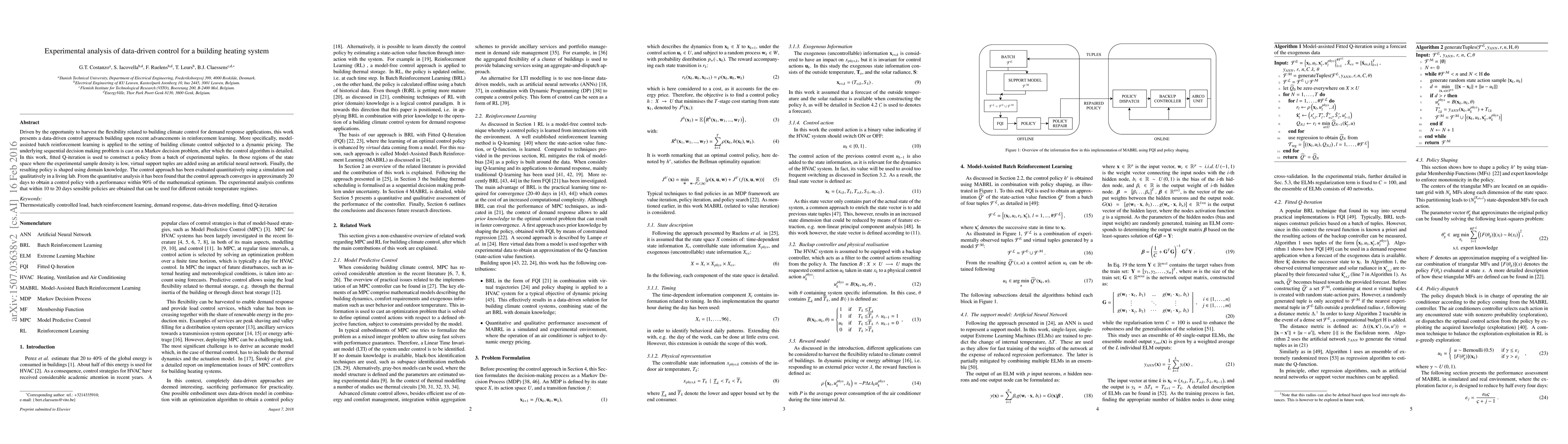 This paper explores a data-driven control method using reinforcement learning for building heating systems, focusing on demand response applications. The approach combines model-assisted batch reinforcement learning, fitted Q-iteration, and neural networks to develop a control policy that converges to near-optimal performance within 20 days.