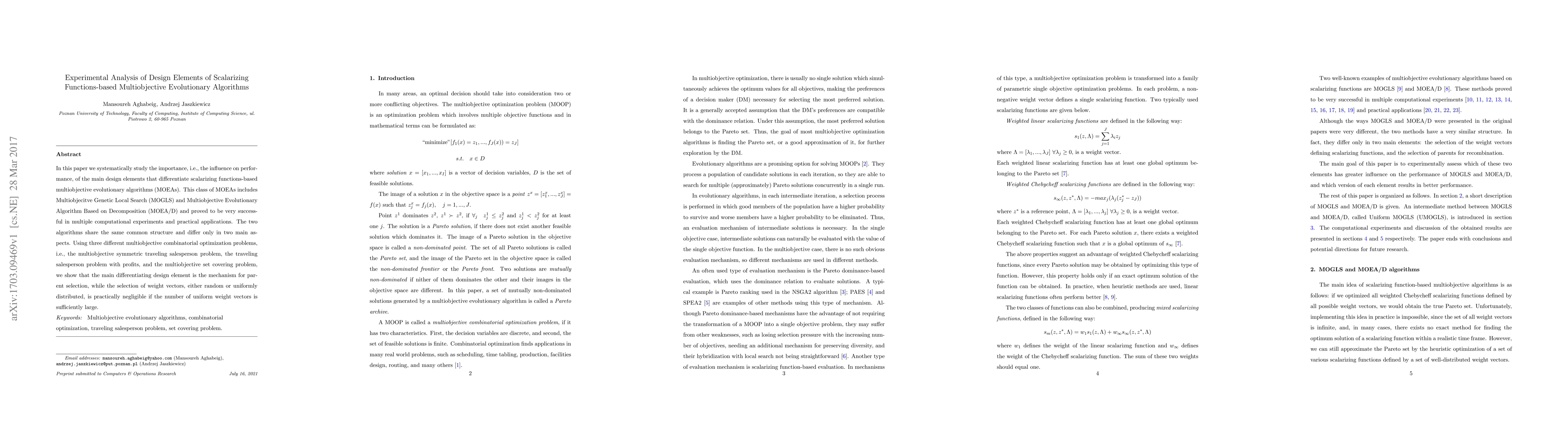 This paper investigates the impact of design elements in scalarizing functions-based multiobjective evolutionary algorithms, focusing on the importance of parent selection mechanisms versus weight vector selection. Results from three optimization problems indicate that parent selection significantly influences performance, while the choice of weight vectors has minimal effect when sufficiently numerous.