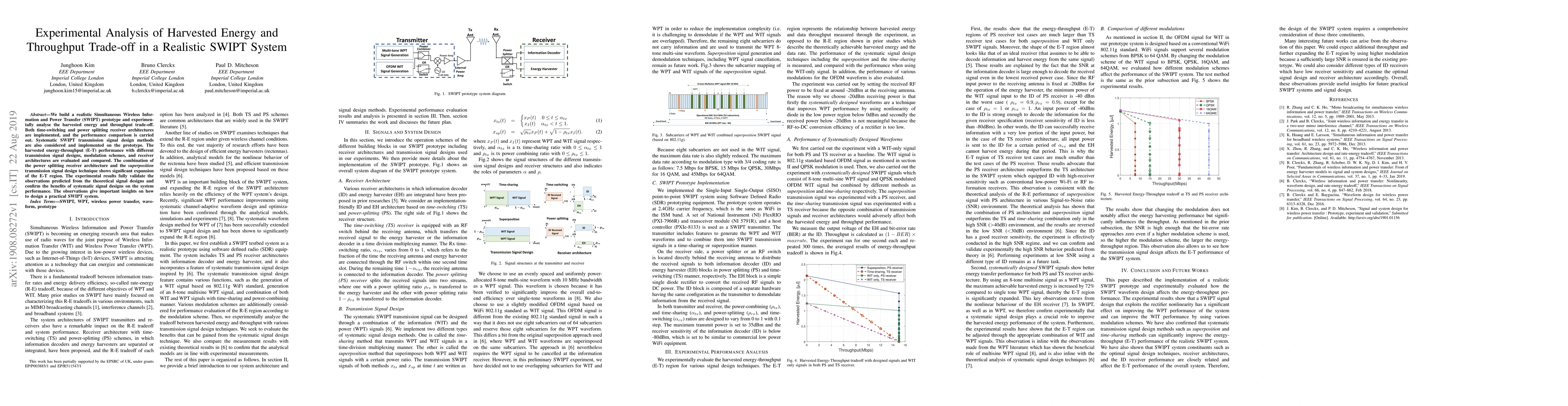 We build a realistic Simultaneous Wireless Information and Power Transfer (SWIPT) prototype and experimentally analyse the harvested energy and throughput trade-off. Both time-switching and power splitting receiver architectures are implemented, and the performance comparison is carried out. Systematic SWIPT transmission signal design methods are also considered and implemented on the prototype. The harvested energy-throughput (E-T) performance with different transmission signal designs, modulation schemes, and receiver architectures are evaluated and compared. The combination of the power splitting receiver architecture and the superposition transmission signal design technique shows significant expansion of the E-T region. The experimental results fully validate the observations predicted from the theoretical signal designs and confirm the benefits of systematic signal designs on the system performance. The observations give important insights on how to design a practical SWIPT system.
