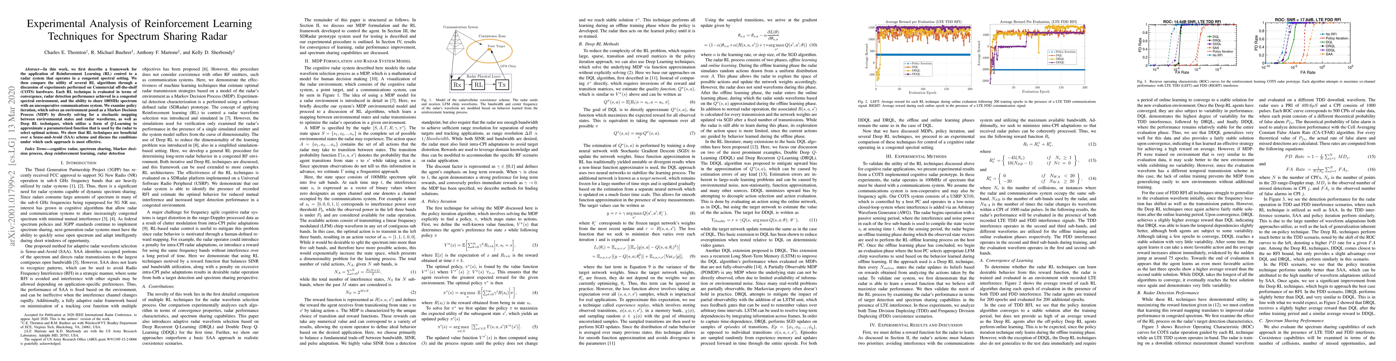This paper explores the application of Reinforcement Learning (RL) techniques to radar systems operating in congested spectral environments, comparing various RL algorithms on COTS hardware to determine their effectiveness in spectrum sharing and radar performance. The study finds RL methods outperform traditional Sense-and-Avoid schemes under specific conditions.