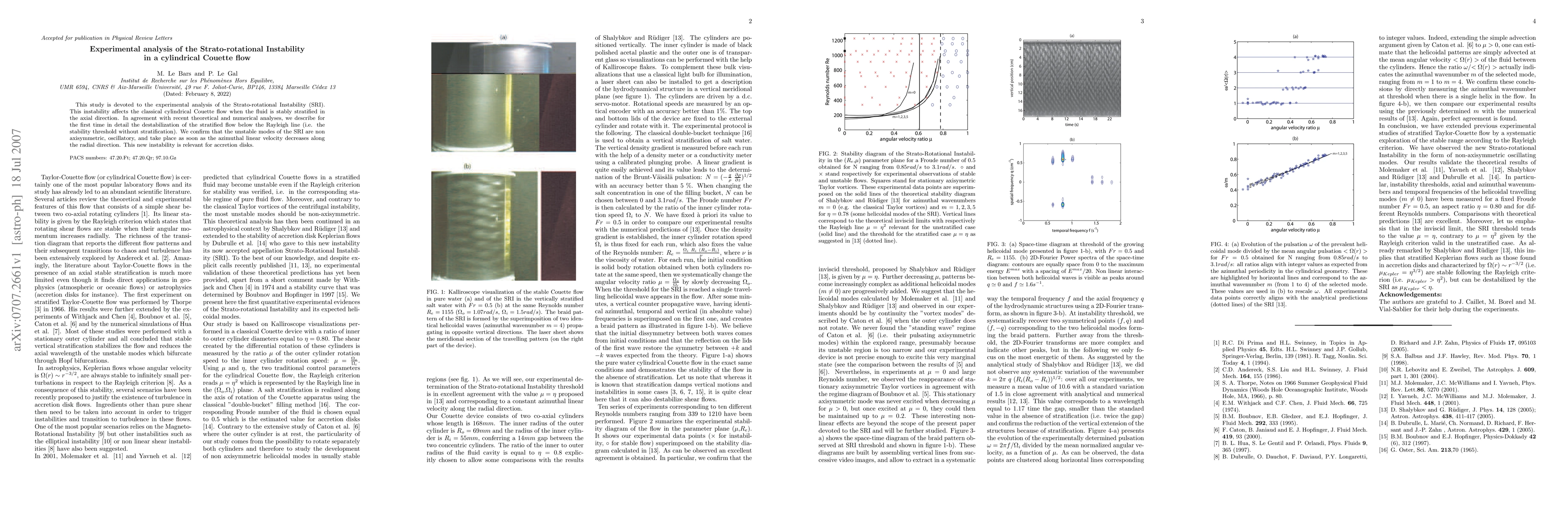 This paper experimentally investigates Strato-rotational Instability (SRI) in cylindrical Couette flow with axial stratification, confirming non-axisymmetric, oscillatory instabilities below the Rayleigh line, relevant for understanding accretion disks.