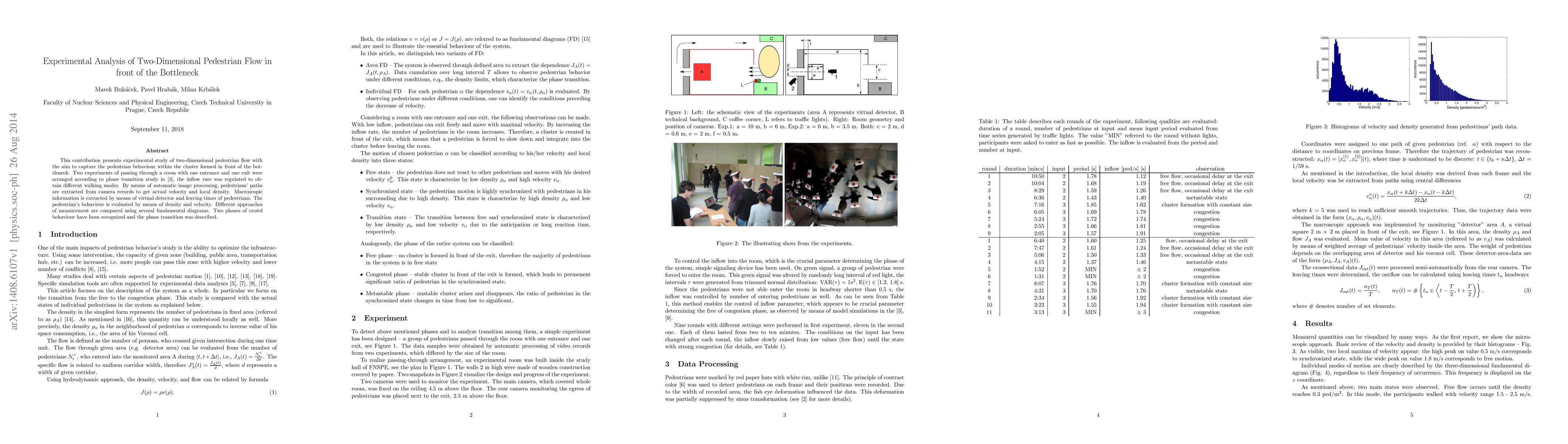 This contribution presents experimental study of two-dimensional pedestrian flow with the aim to capture the pedestrian behaviour within the cluster formed in front of the bottleneck. Two experiments of passing through a room with one entrance and one exit were arranged according to phase transition study in Ezaki et al. (2012), the inflow rate was regulated to obtain different walking modes. By means of automatic image processing, pedestrians' paths are extracted from camera records to get actual velocity and local density. Macroscopic information is extracted by means of virtual detector and leaving times of pedestrians. The pedestrian's behaviour is evaluated by means of density and velocity. Different approaches of measurement are compared using several fundamental diagrams. Two phases of crowd behaviour have been recognized and the phase transition was described.