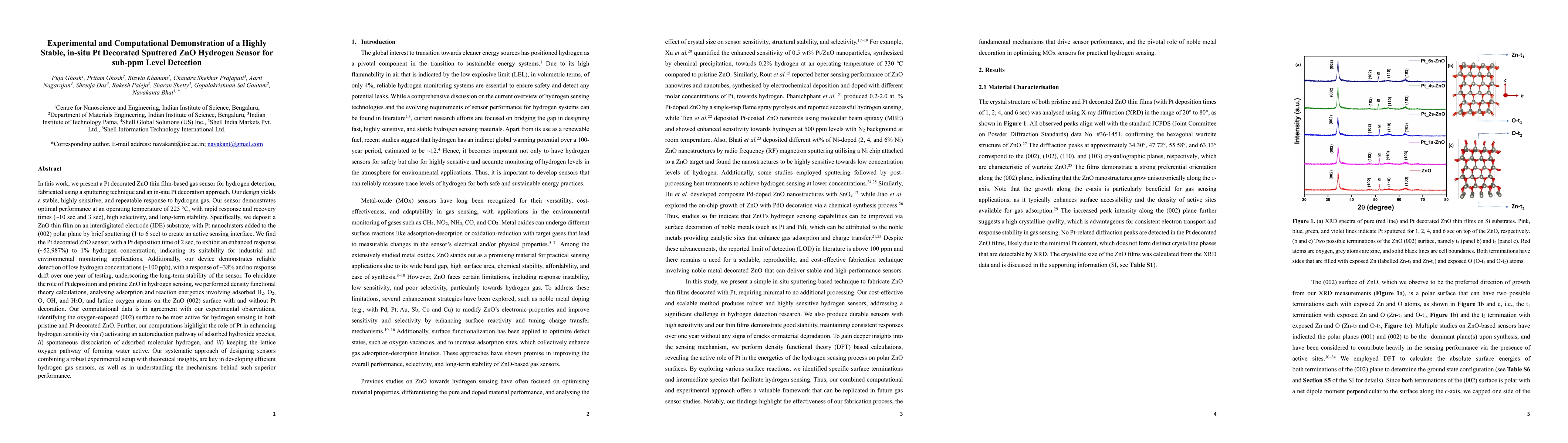 In this work, we present a Pt decorated ZnO thin film-based gas sensor for hydrogen detection, fabricated using a sputtering technique and an in-situ Pt decoration approach. Specifically, we deposit a ZnO thin film on an interdigitated electrode substrate, with Pt nanoclusters added to the (002) polar plane by brief sputtering (1 to 6 s) to create an active sensing interface. Our sensor demonstrates optimal performance at an operating temperature of 498 K, with rapid response and recovery times (10 and 3 s), high selectivity, and long-term stability. We find the Pt decorated ZnO sensor, with a Pt deposition time of 2 s, to exhibit enhanced response (~52,987%) to 1% hydrogen concentration, indicating its suitability for industrial and environmental monitoring applications. Additionally, our device demonstrates reliable detection of low hydrogen concentrations (~100 ppb), with a response of ~38% and no response drift over one year of testing, underscoring the long-term stability of the sensor. To elucidate the role of Pt deposition and pristine ZnO in hydrogen sensing, we perform density functional theory calculations, analysing adsorption and reaction energetics involving H2, O2, O, OH, and H2O, and lattice oxygen atoms on the ZnO (002) surface with and without Pt decoration. Our computational data is in agreement with our experiments, identifying the oxygen-exposed (002) surface to be most active for hydrogen sensing in both pristine and Pt decorated ZnO. Further, our computations highlight the role of Pt in enhancing hydrogen sensitivity via i) activating an autoreduction pathway of adsorbed OH, ii) spontaneous dissociation of adsorbed molecular H2, and iii) keeping the lattice oxygen pathway of forming H2O active. Our systematic approach of designing sensors combining an experimental setup with theoretical insights, is key in developing and optimizing efficient hydrogen gas sensors.