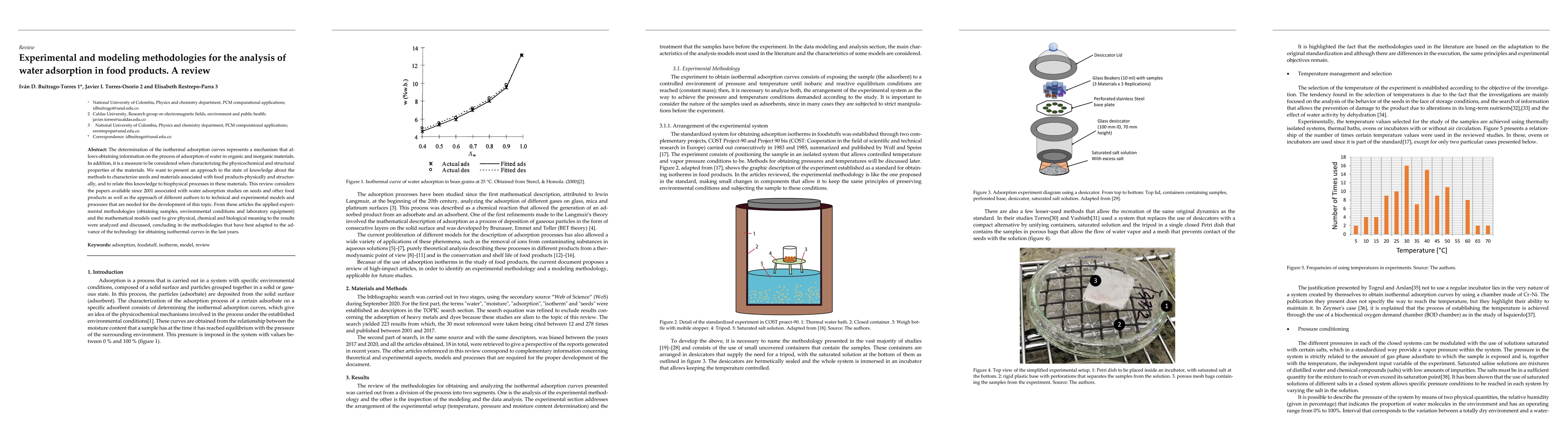 The determination of the isothermal adsorption curves represents a mechanism that allows ob-taining information on the process of adsorption of water in organic and inorganic materials. In addition, it is a measure to be considered when characterizing the physicochemical and structural properties of the materials. We want to present an approach to the state of knowledge about the methods to characterize seeds and materials associated with food products physically and struc-turally, and to relate this knowledge to biophysical processes in these materials. This review considers the papers available since 2001 associated with water adsorption studies on seeds and other food products as well as the approach of different authors to to technical and experimental models and processes that are needed for the development of this topic. From these articles the applied experimental methodologies (obtaining samples, environmental conditions and labor-atory equipment) and the mathematical models used to give physical, chemical and biological meaning to the results were analyzed and discussed, concluding in the methodologies that have best adapted to the advance of the technology for obtaining isothermal curves in the last years.