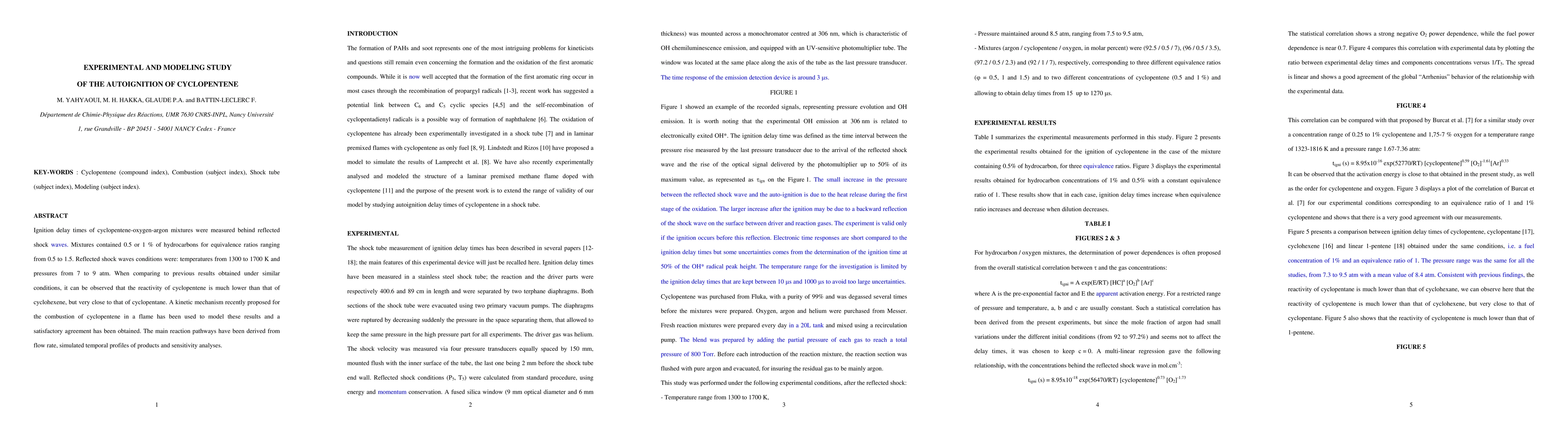 This study experimentally measures ignition delay times of cyclopentane-oxygen-argon mixtures under shock wave conditions and models the results using a proposed kinetic mechanism. The findings show that cyclopentene's reactivity is lower than cyclohexene's but similar to cyclopentane's, with the model providing a good fit to the experimental data.