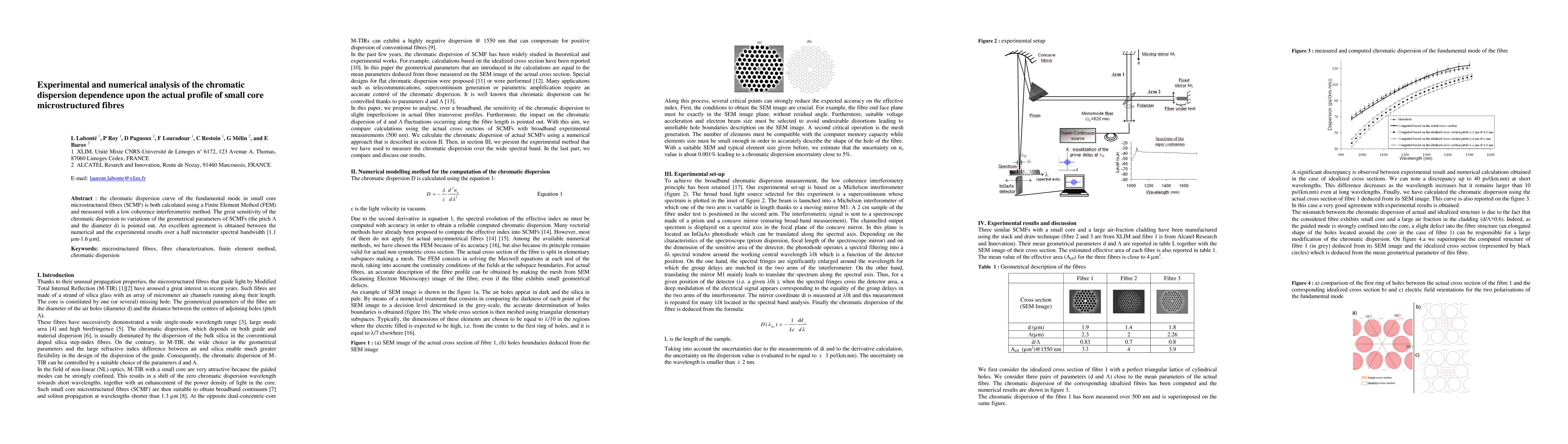 This study investigates the chromatic dispersion in small core microstructured fibres (SCMF) using both Finite Element Method calculations and low coherence interferometry measurements. It highlights the significant impact of geometrical variations on dispersion, with excellent agreement between numerical and experimental results across a spectral bandwidth of 1.1 to 1.6 micrometers.