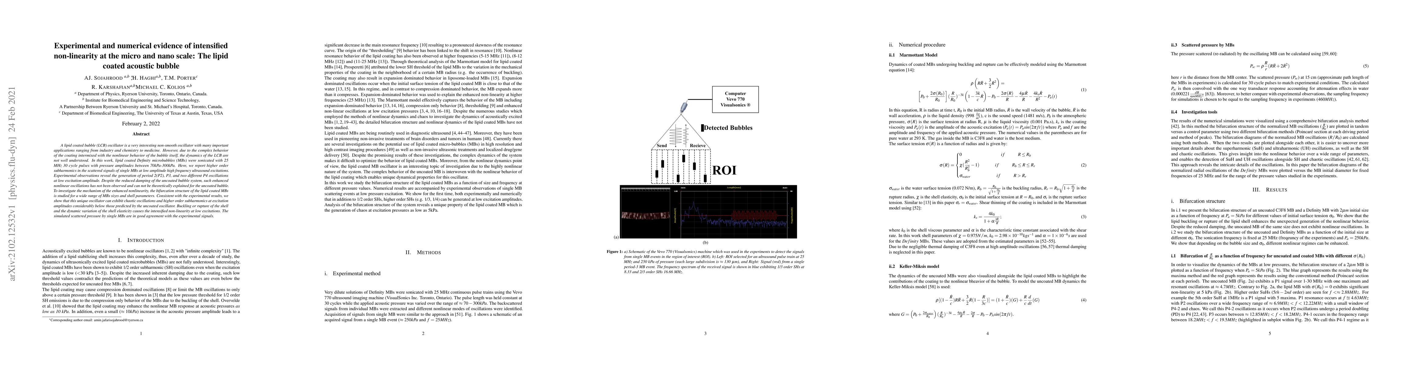 A lipid coated bubble (LCB) oscillator is a very interesting non-smooth oscillator with many important applications ranging from industry and chemistry to medicine. However, due to the complex behavior of the coating intermixed with the nonlinear behavior of the bubble itself, the dynamics of the LCB are not well understood. In this work, lipid coated Definity microbubbles (MBs) were sonicated with 25 MHz 30 cycle pulses with pressure amplitudes between 70kPa-300kPa. Here, we report higher order subharmonics in the scattered signals of single MBs at low amplitude high frequency ultrasound excitations. Experimental observations reveal the generation of period 2(P2), P3, and two different P4 oscillations at low excitation amplitude. Despite the reduced damping of the uncoated bubble system, such enhanced nonlinear oscillations has not been observed and can not be theoretically explained for the uncoated bubble. To investigate the mechanism of the enhanced nonlinearity, the bifurcation structure of the lipid coated MBs is studied for a wide range of MBs sizes and shell parameters. Consistent with the experimental results, we show that this unique oscillator can exhibit chaotic oscillations and higher order subharmonics at excitation amplitudes considerably below those predicted by the uncoated oscillator. Buckling or rupture of the shell and the dynamic variation of the shell elasticity causes the intensified non-linearity at low excitations. The simulated scattered pressure by single MBs are in good agreement with the experimental signals.