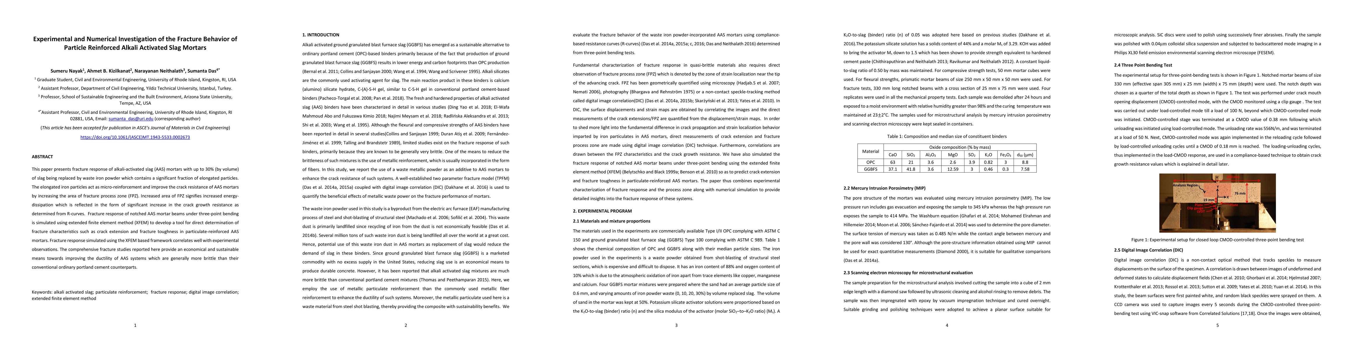 This study investigates the fracture behavior of alkali-activated slag mortars reinforced with waste iron powder, showing improved crack resistance due to increased fracture process zone area. Numerical simulations using extended finite element method correlate well with experimental results, offering a sustainable method to enhance the ductility of these typically brittle mortars.
